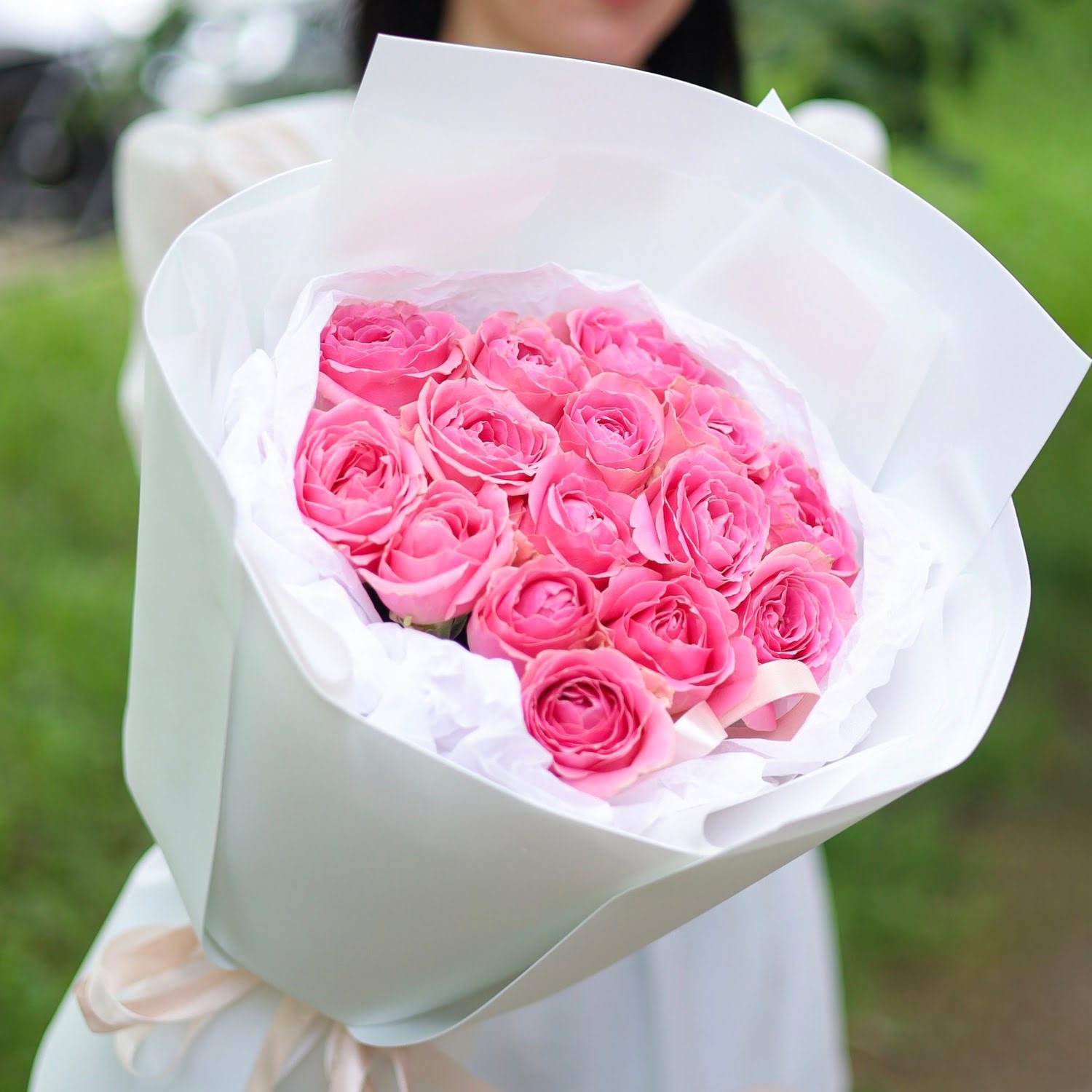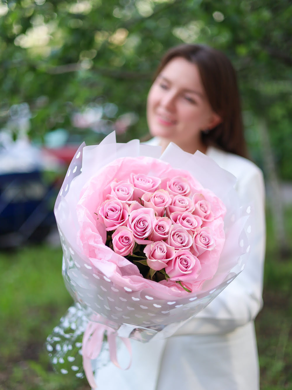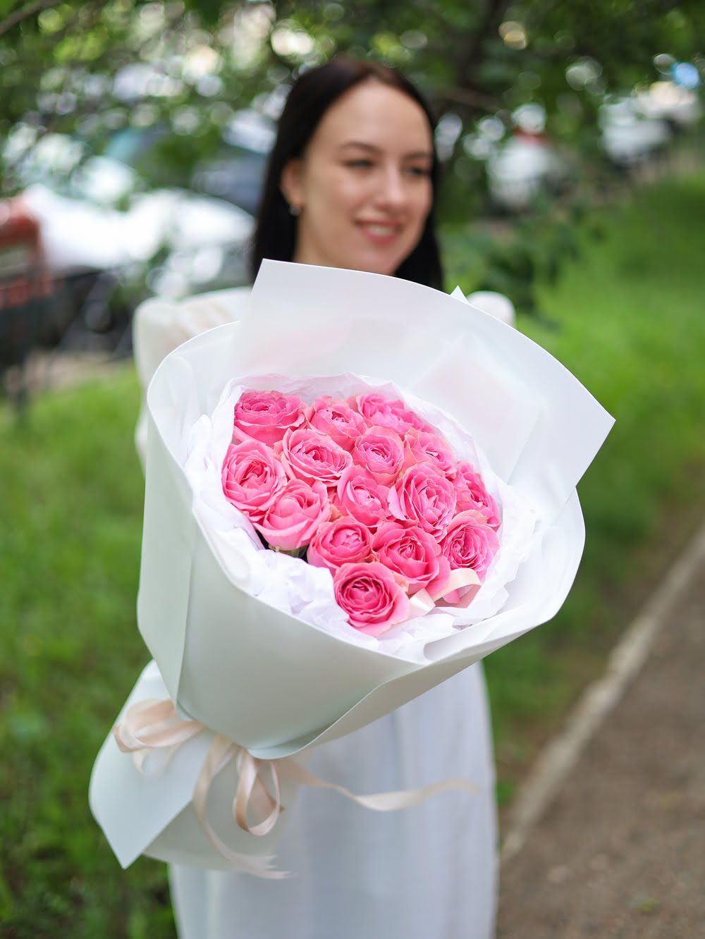Букет из 15 розовых роз в оформлении. Оттенок роз возможен от нежного до насыщенного.