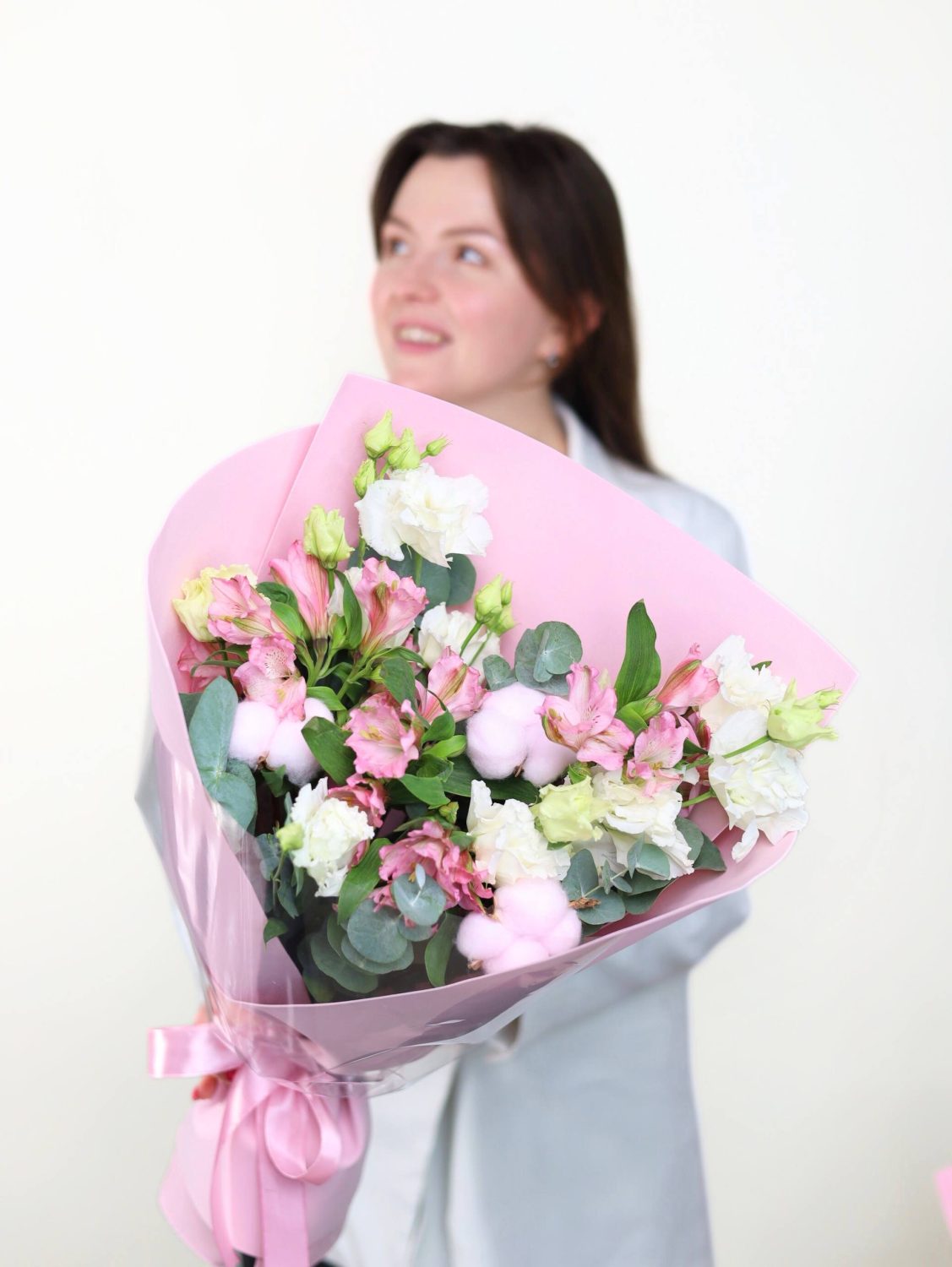 Состав: стойкая альстромерия, ажурная эустома, хлопок, эвкалипт.