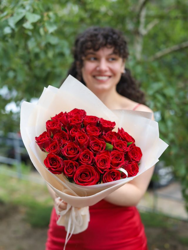 Очаровательный букет из 25-ти красных роз в стильном оформлении.