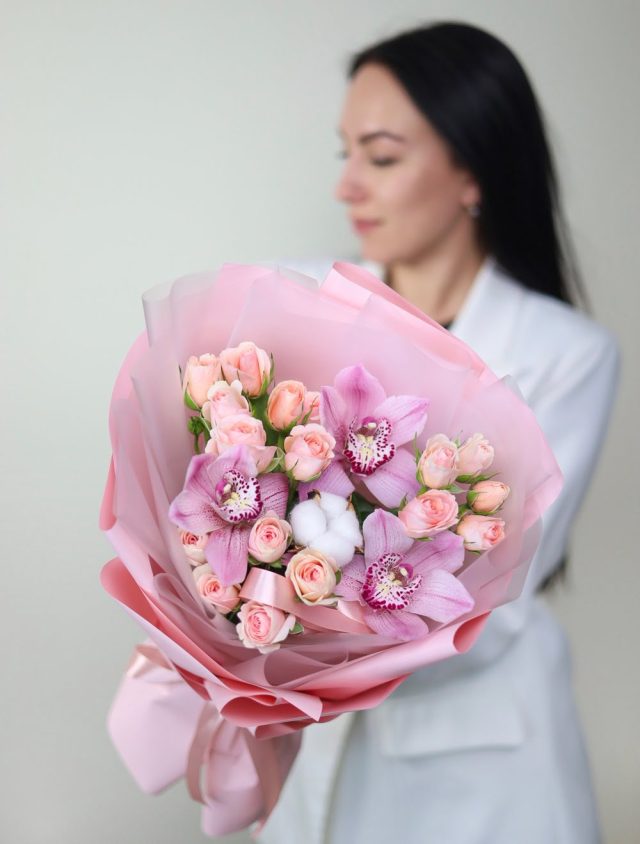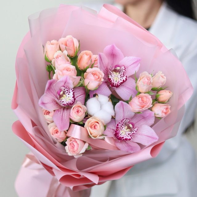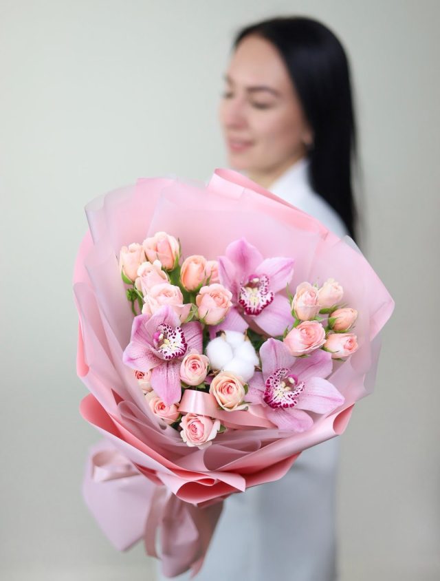 Состав: орхидея, кустовой пионовидной розы, хлопок (или другой сухоцвет). Оттенок цветов может отличаться согласно наличию и по обязательному согласованию с заказчиком. Высота букета около 47 см.
