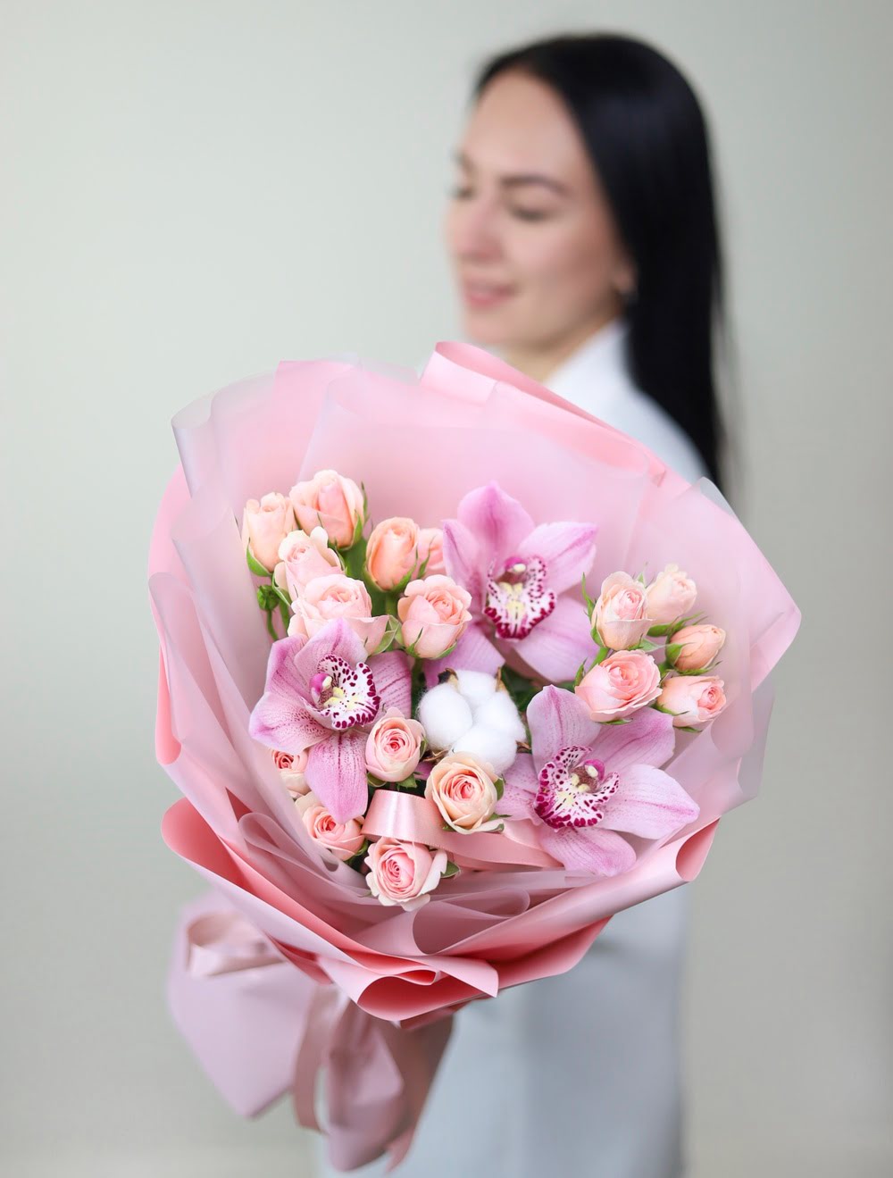 Нежный и стойкий букет из орхидей и кустовых роз. Все эти цветы отличает небывалая стойкость. Букет будет радовать счастливого получателя не менее недели. Возможно сделать этот букет больше по размеру.