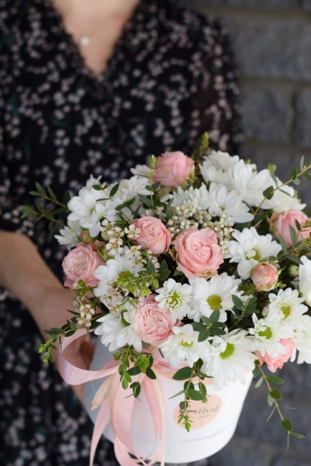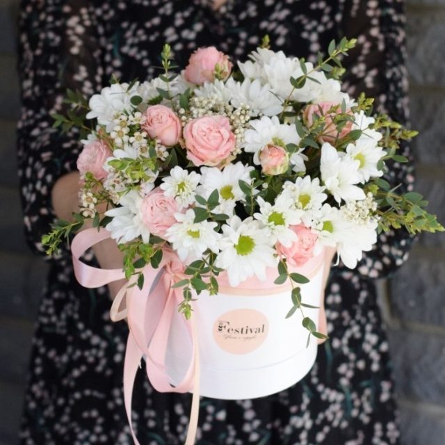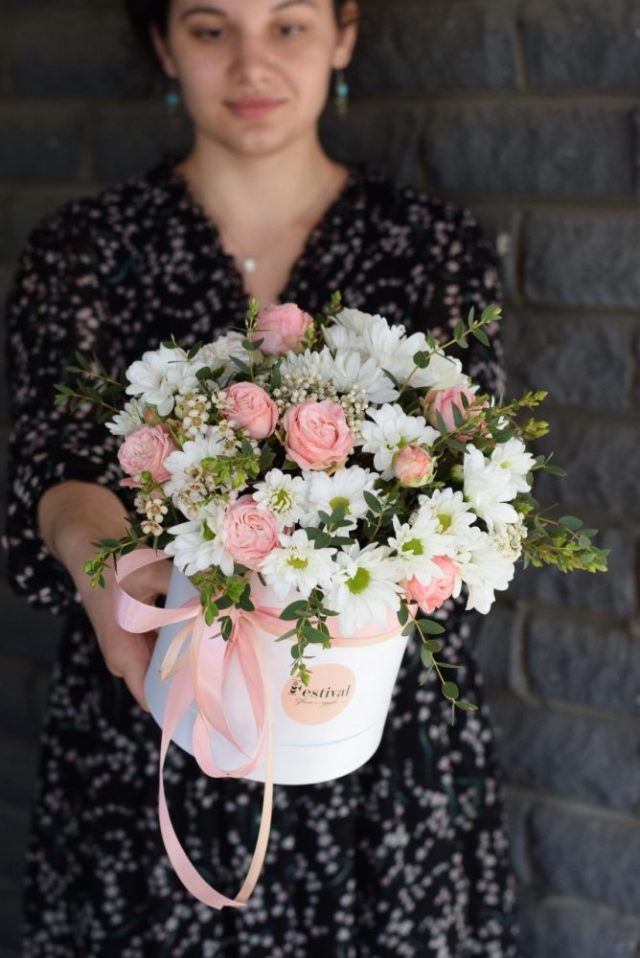 Красивая и объемная композиция с хризантемами и кустовыми розочками в шляпной коробке!