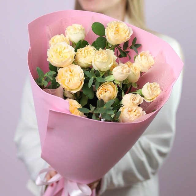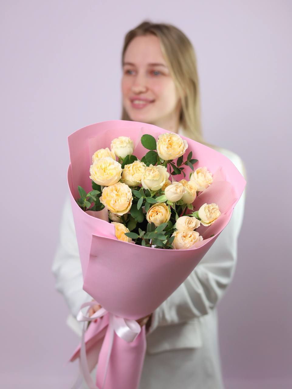 Красивый букет из 3-х веток кустовых пионовидных роз с эвкалиптом в оформлении.