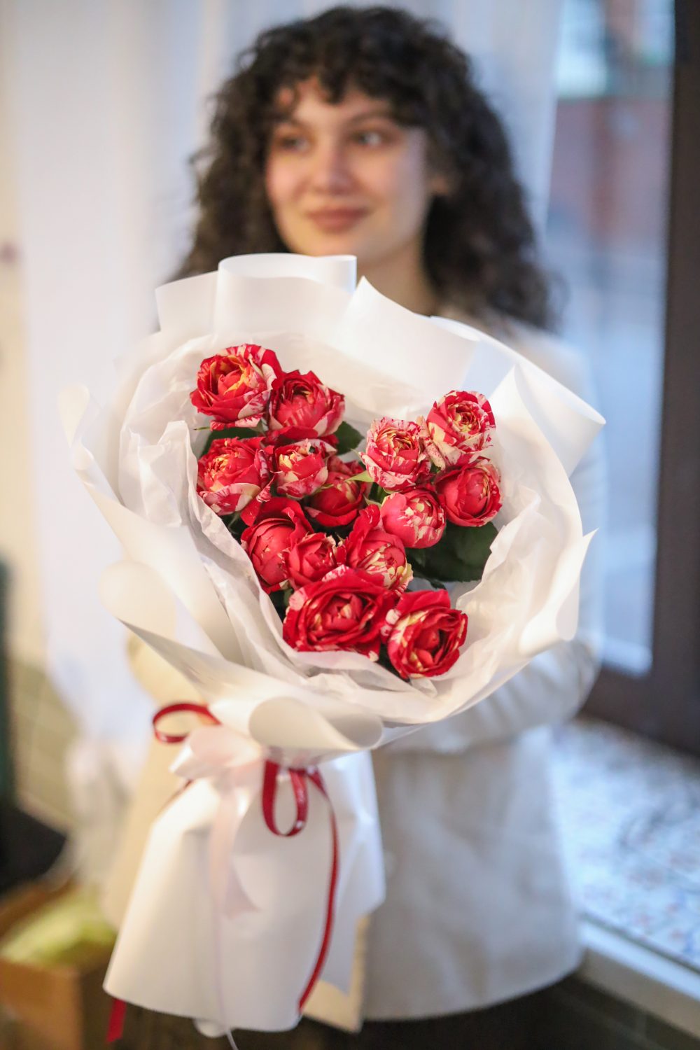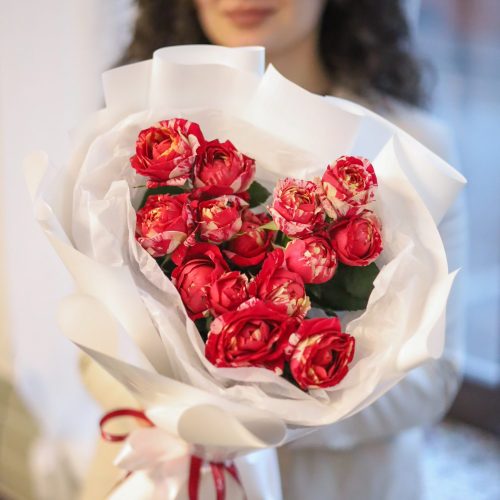 Стильный букет ярких пионовидных роз в оформлении.