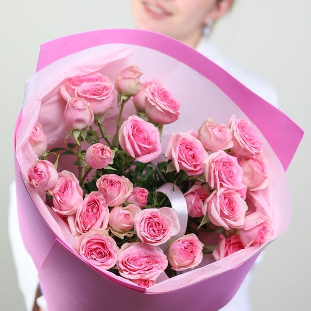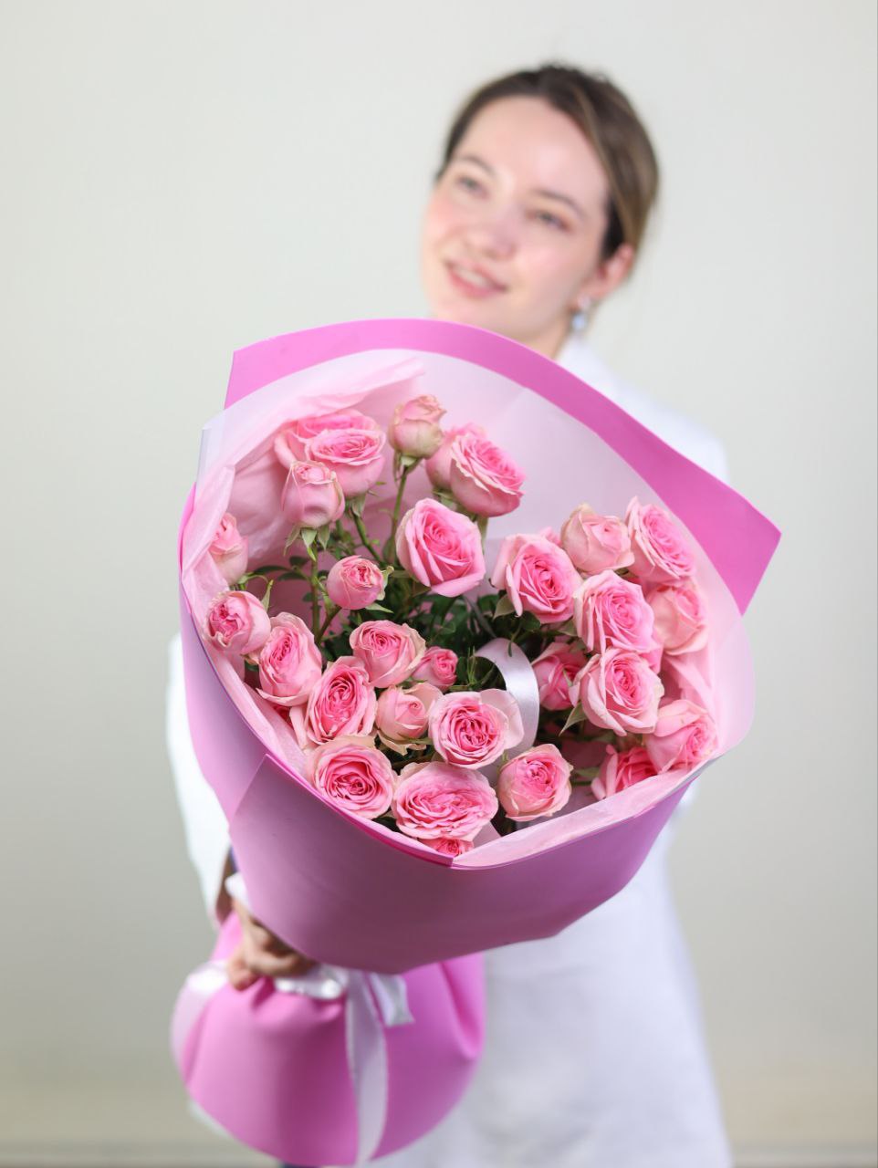 Букет из 5-ти кустовых пионовидных роз в оформлении.