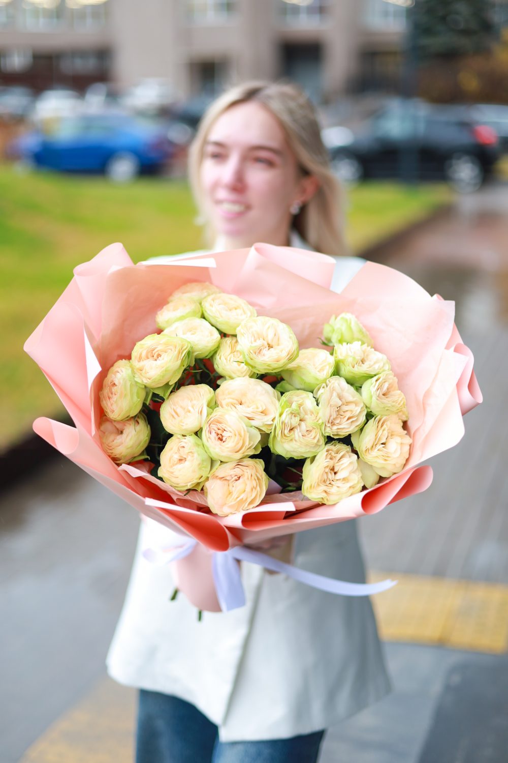 Очаровательный объемный букет кремовых кустовых пионовидных роз с крупным бутоном в оформлении.