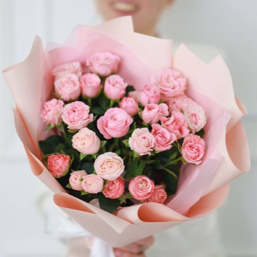 Прекрасный букет кустовых пионовидных роз в стильном оформлении.
