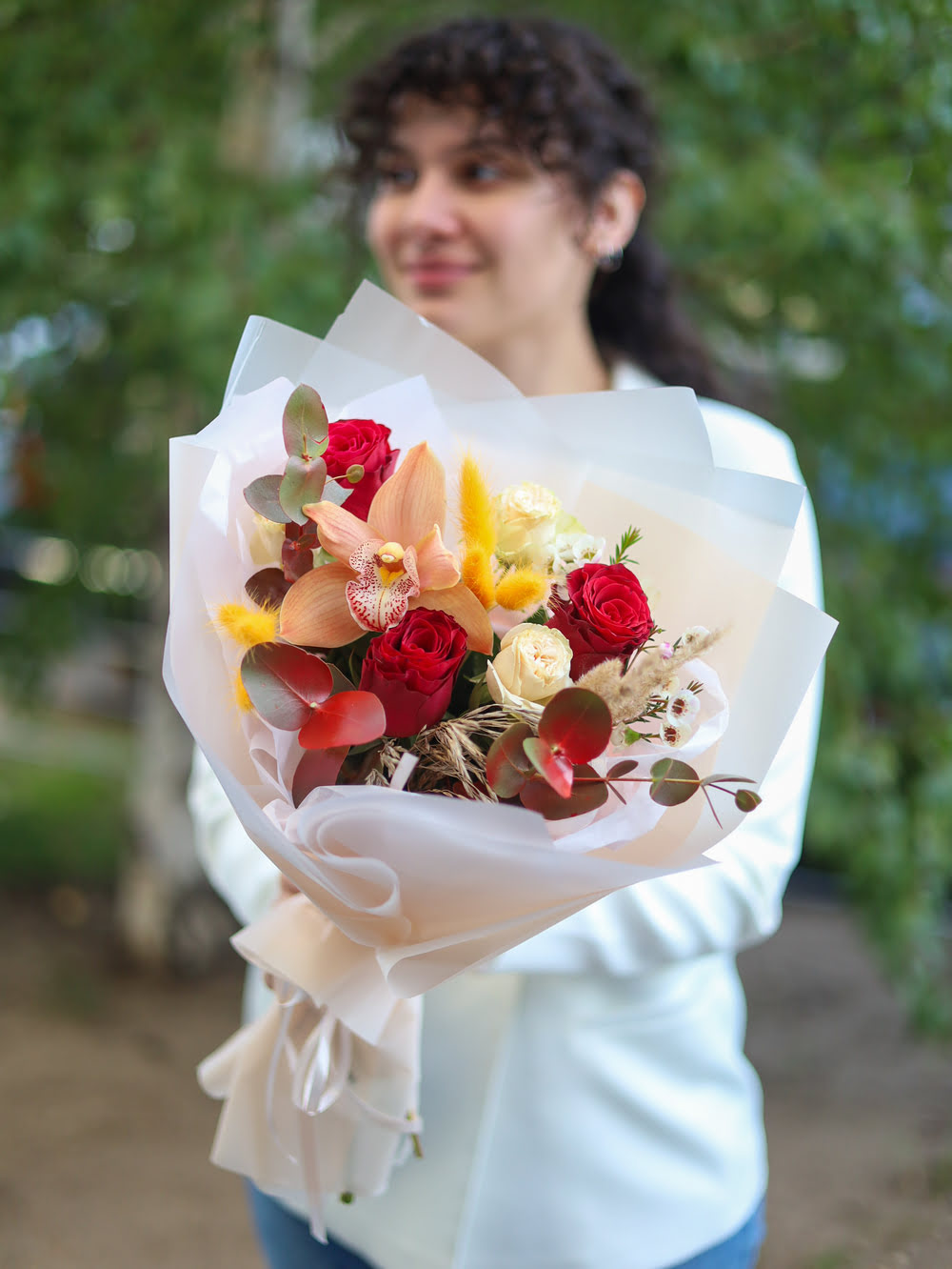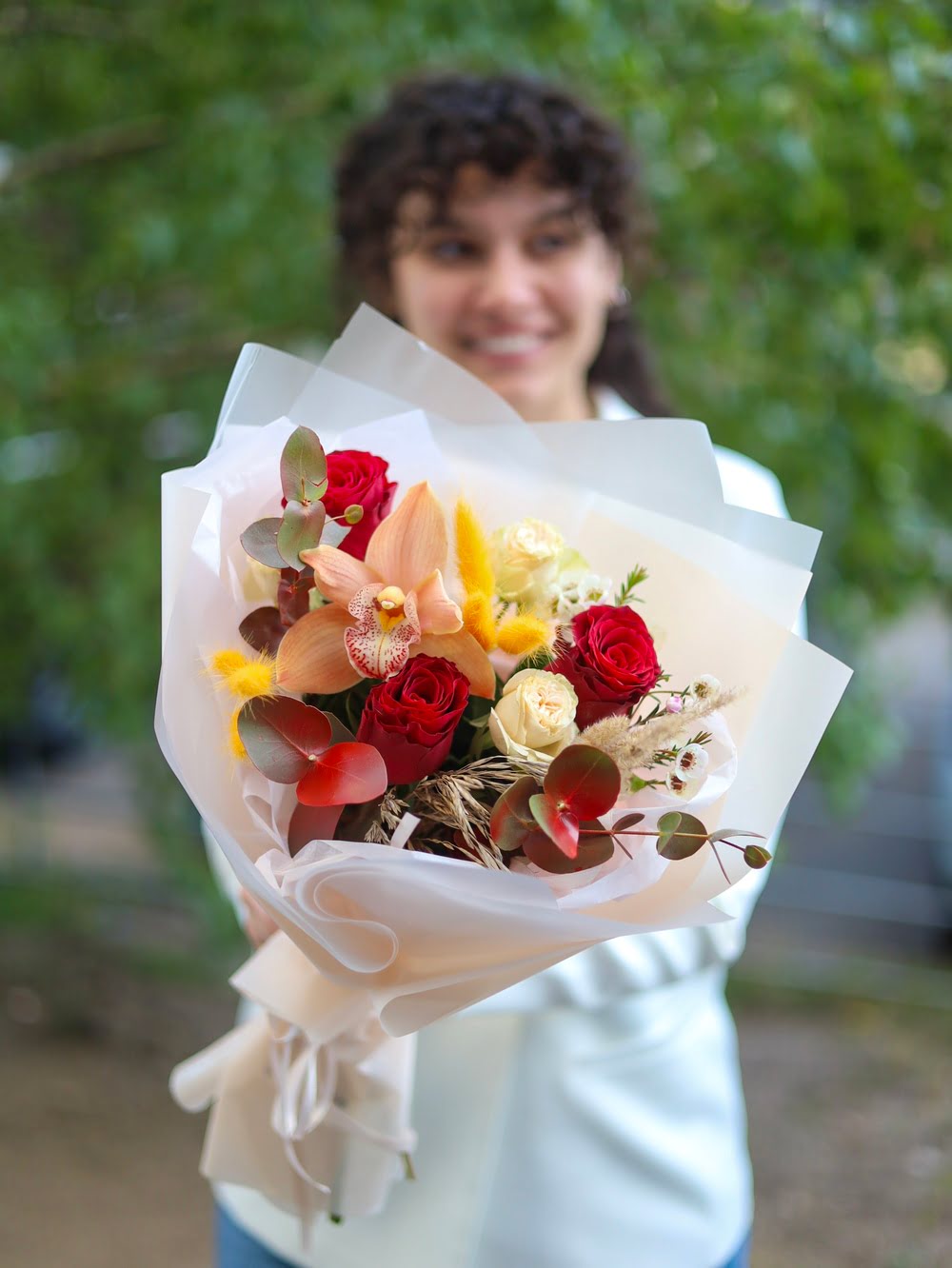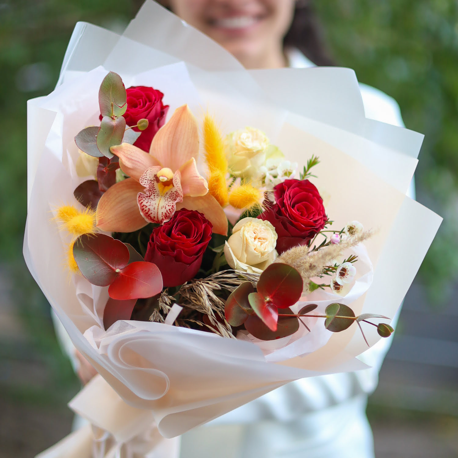 Состав: одноголовые и кустовые розы, одноголовая орхидея, эвкалипт, хамелациум и сухоцветы.