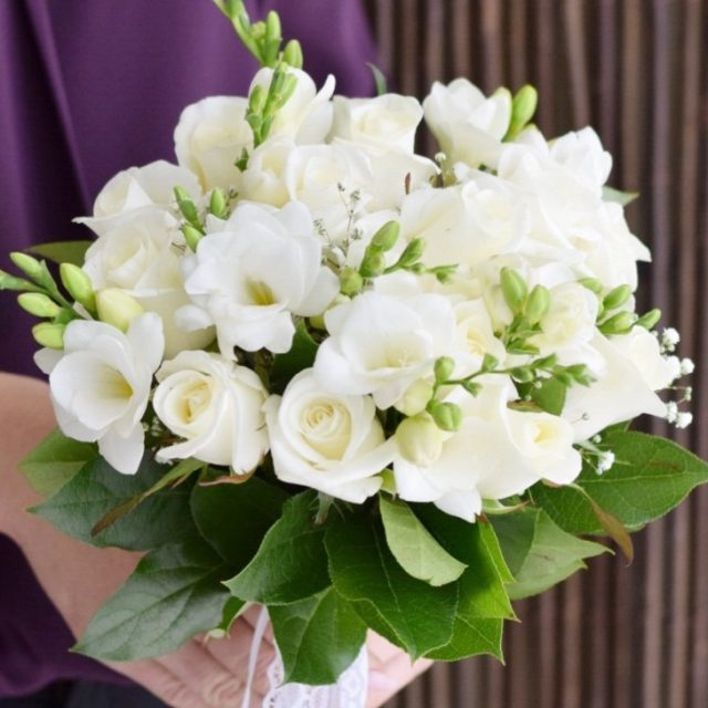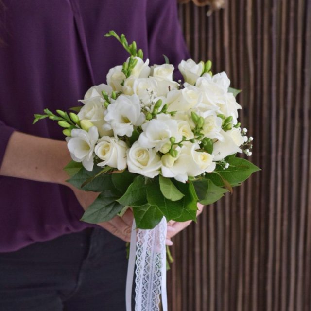 Лаконичный и аккуратный букет с белыми розами и ароматными фрезиями.