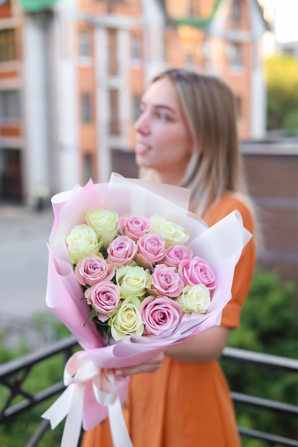 Красивый букет из 15 роз микс белого и розового цвета в оформлении.