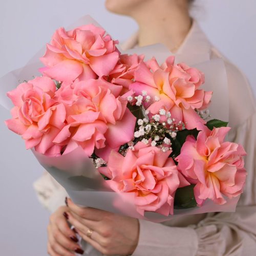 Букет нежных кустовых сортовых роз в красивом оформлении.