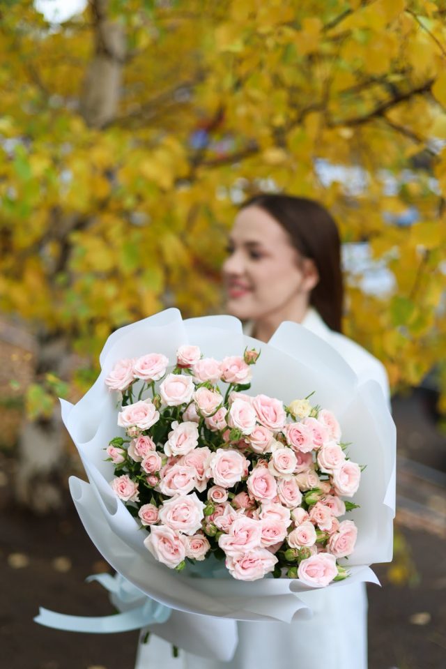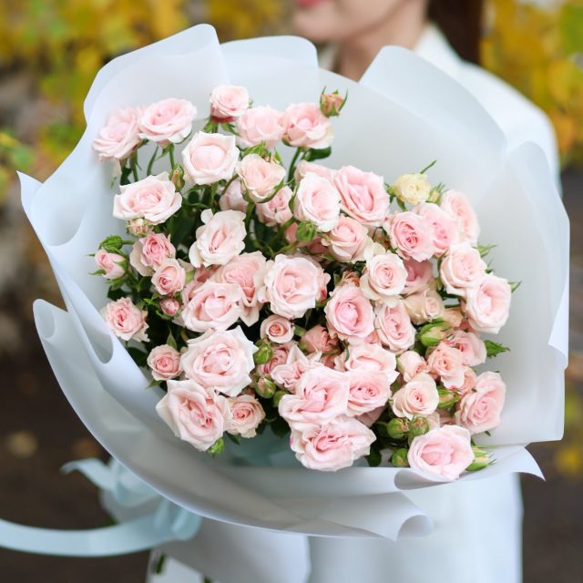 Прекрасный букет нежно-розовых кустовых роз в оформлении.