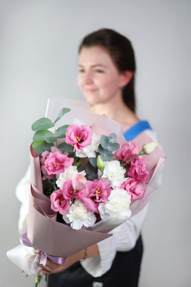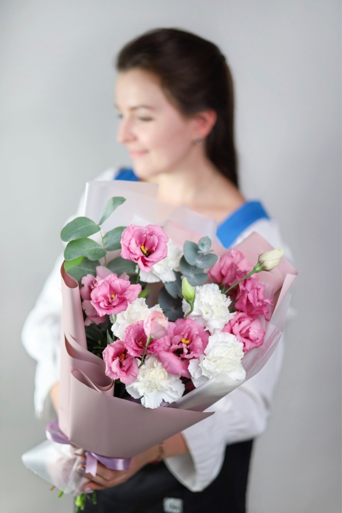 В букете: ажурная эустома, стойкие диантусы, душистый эвкалипт. Высота: около 50 см.
