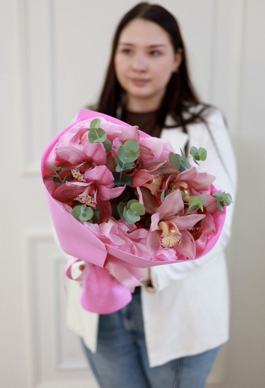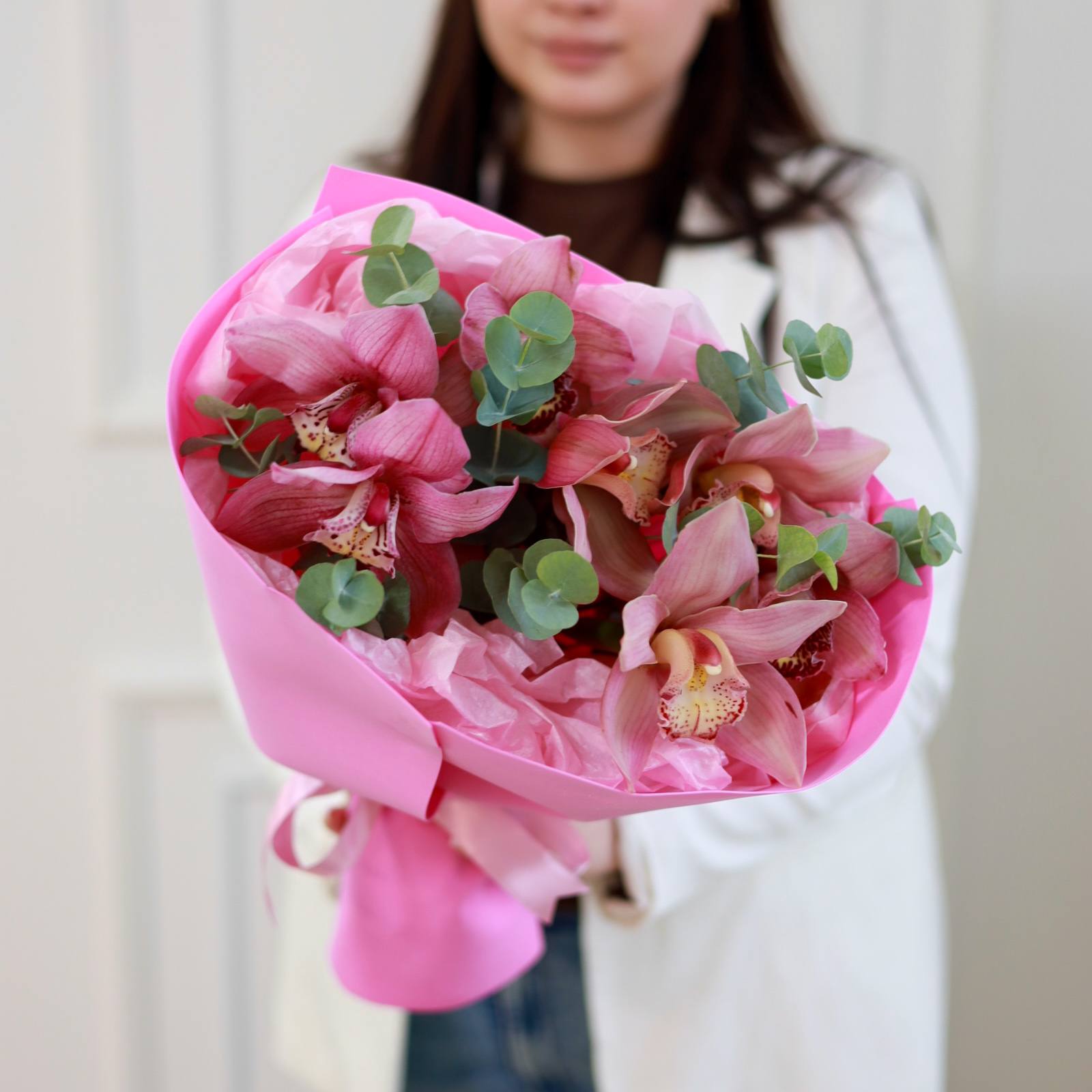 Очень стойкий букет из 7 орхидей с эвкалиптом в оформлении.