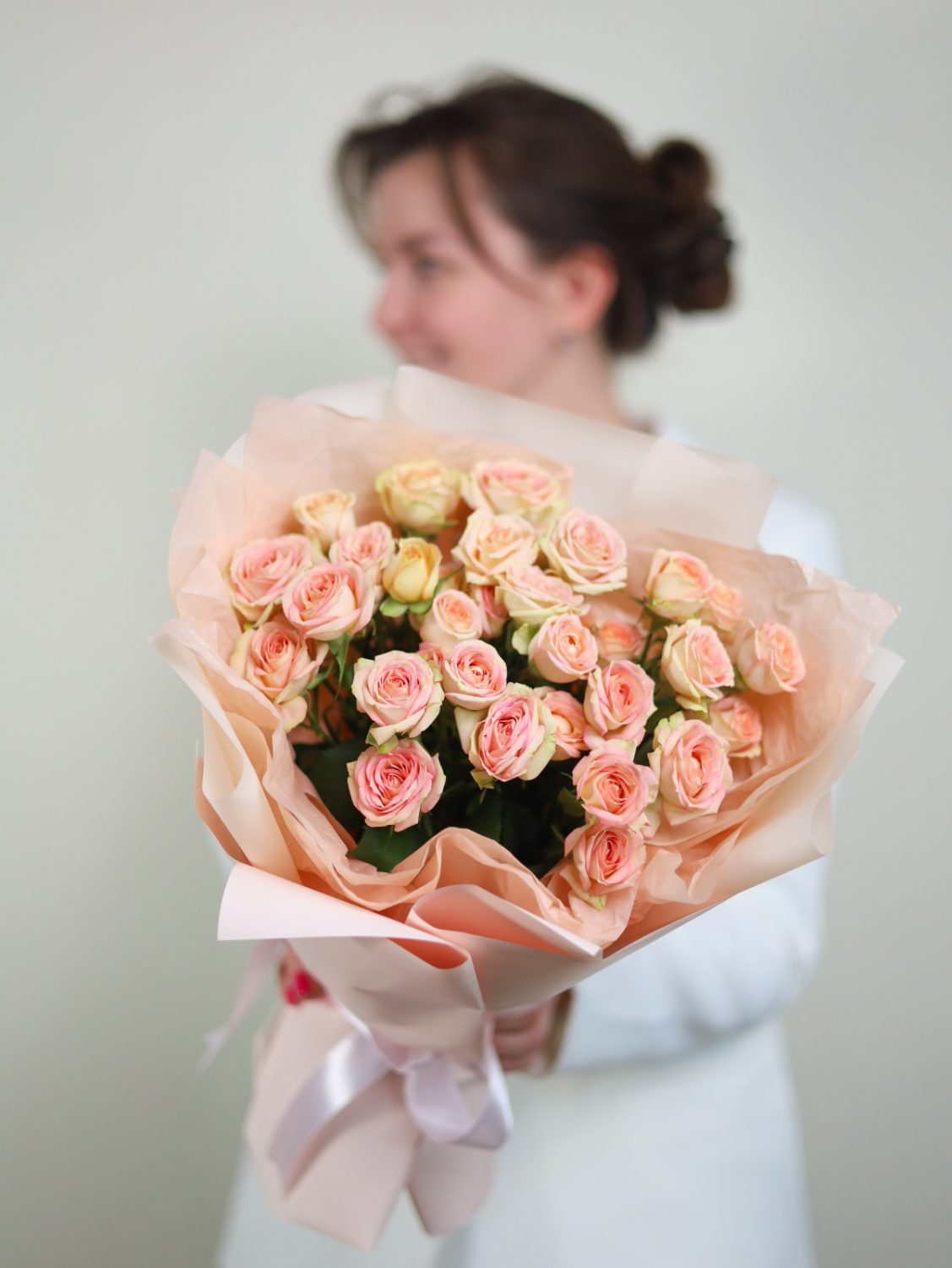 Красивый букет кустовых роз в оформлении.