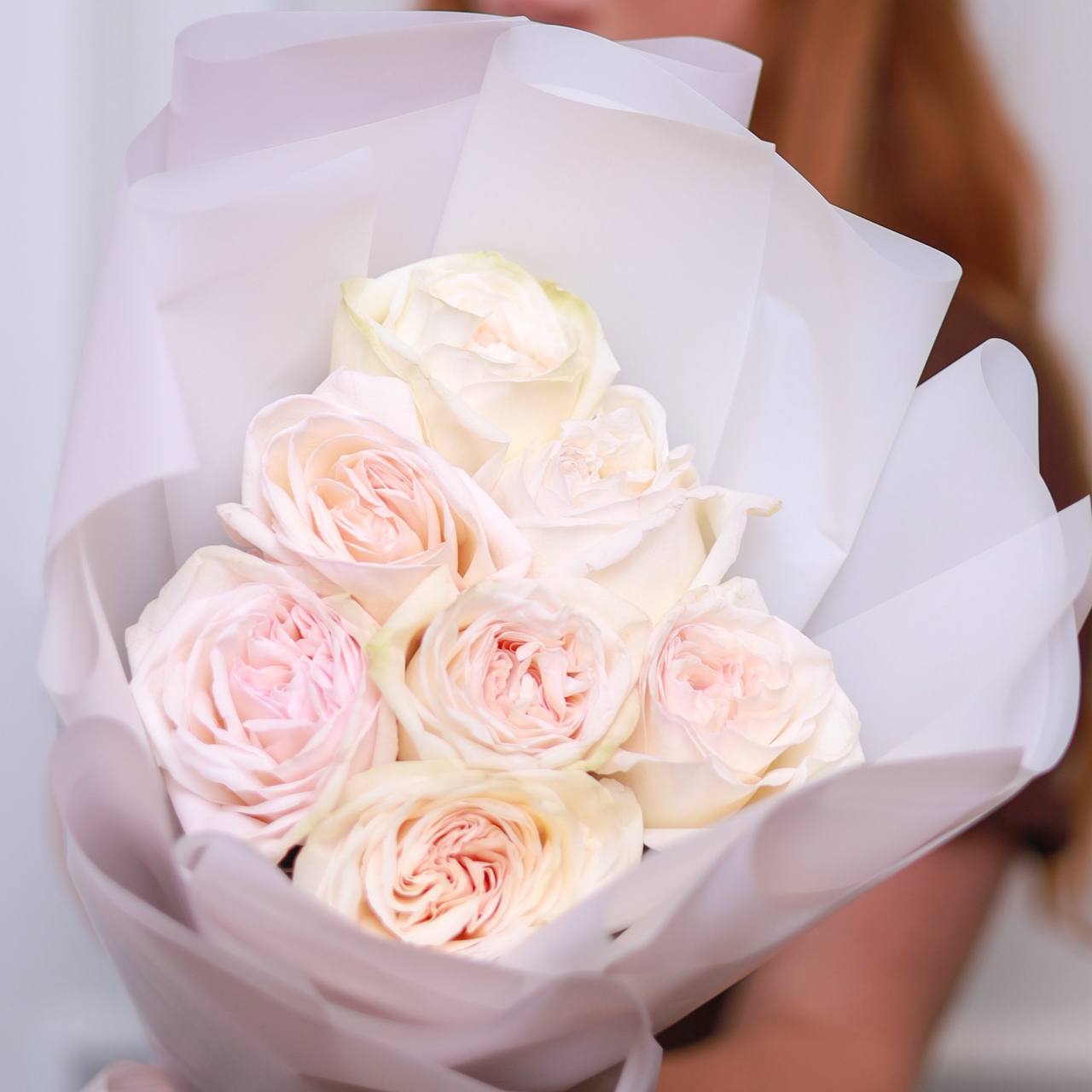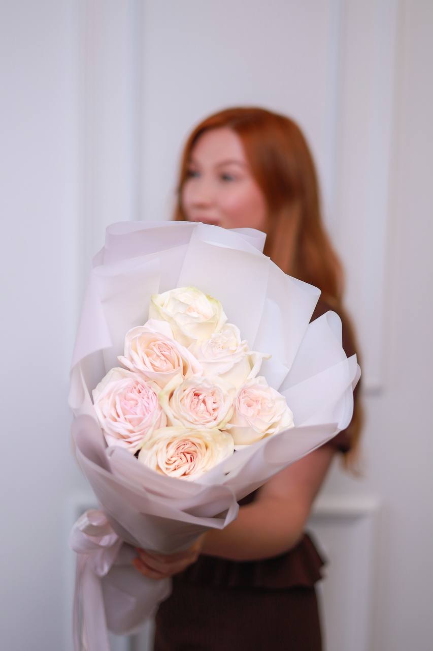 Букет из 7 пионовидных крупных роз в оформлении.