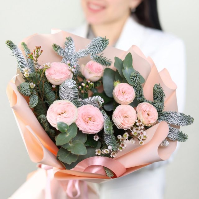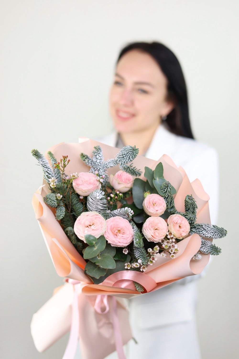 Очаровательный ароматный букет с пионовидными кустовыми розами, хамелациумом, эвкалиптом и нобилисом.