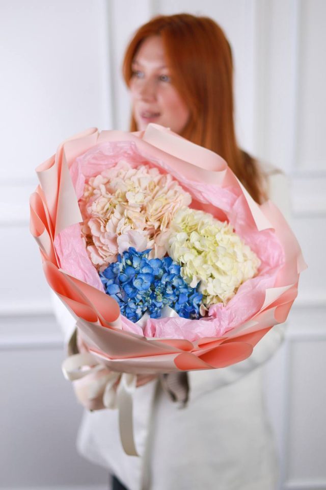 Букет из 3х гортензий в оформлении.