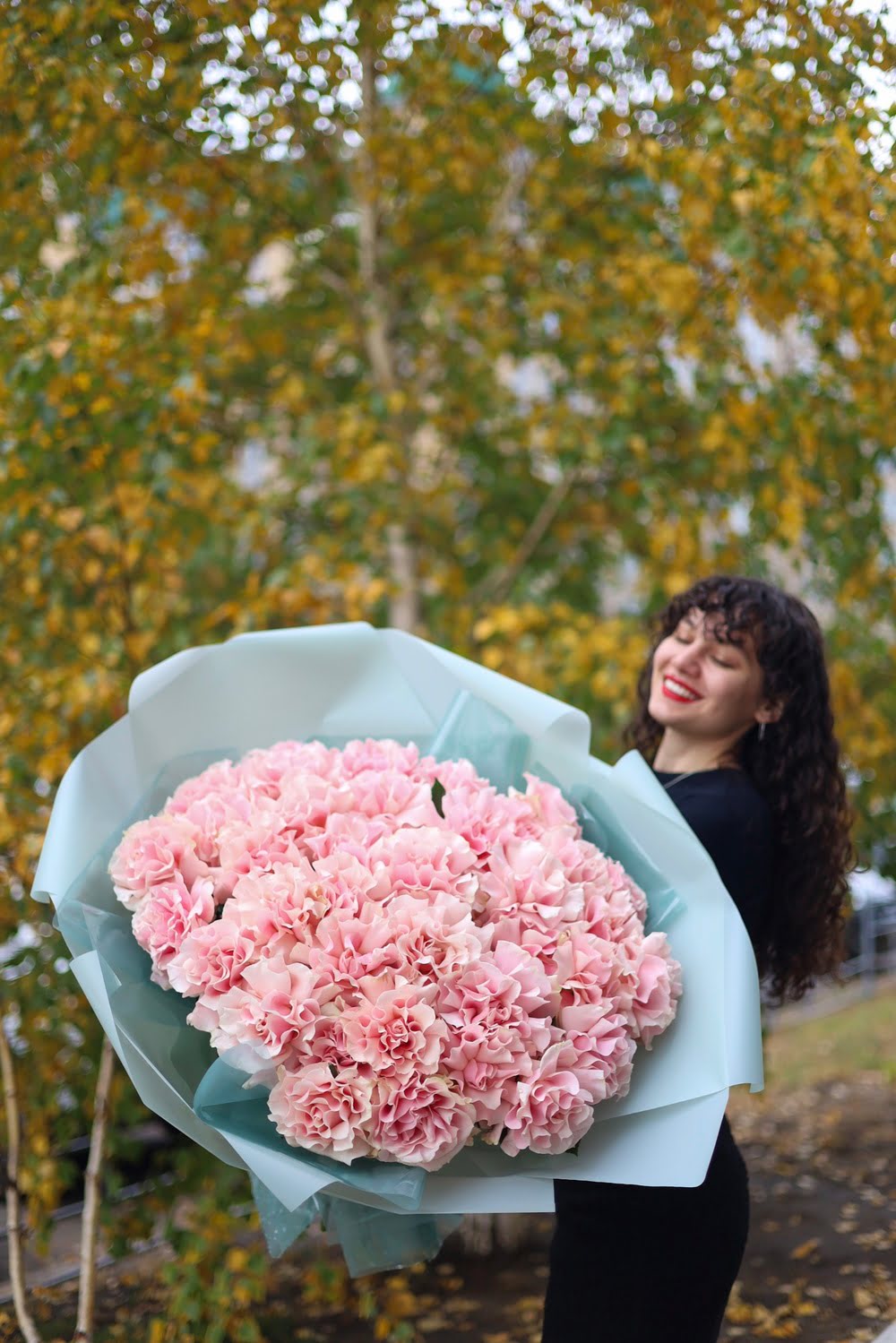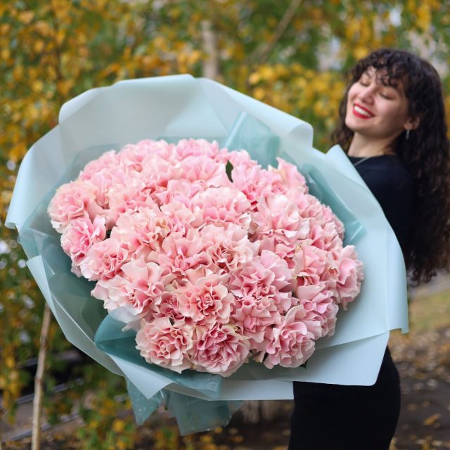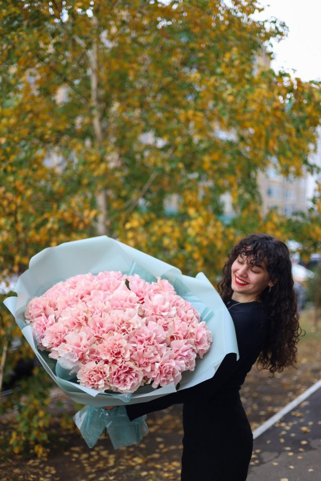 Потрясающий букет крупных французских роз нежно-розового цвета. В букете 35 роз.