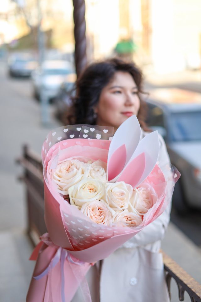 Очаровательный букет из 7-ми крупных пионовидных роз White O’Hara в оформлении с “ушками”.