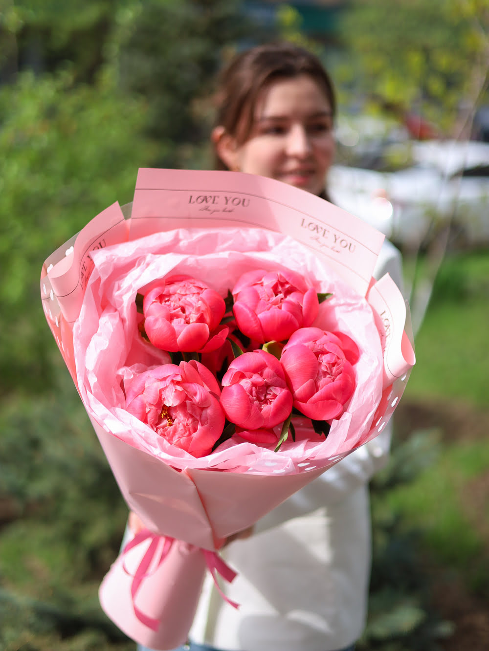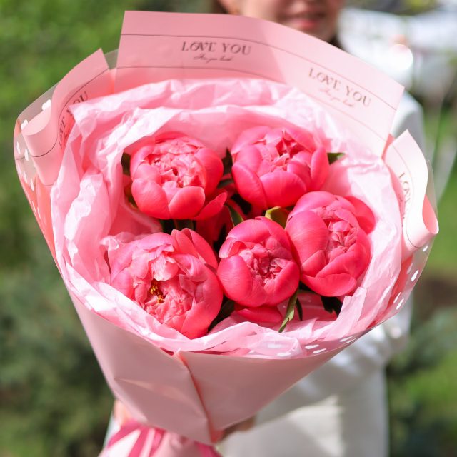 Букет крупных коралловых пионов сорта Корал Шарм в стильном оформлении. Букет из 5 пионов.