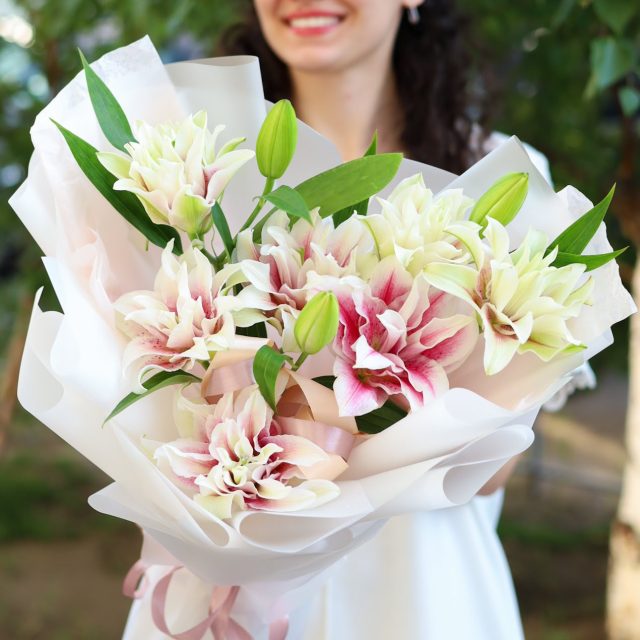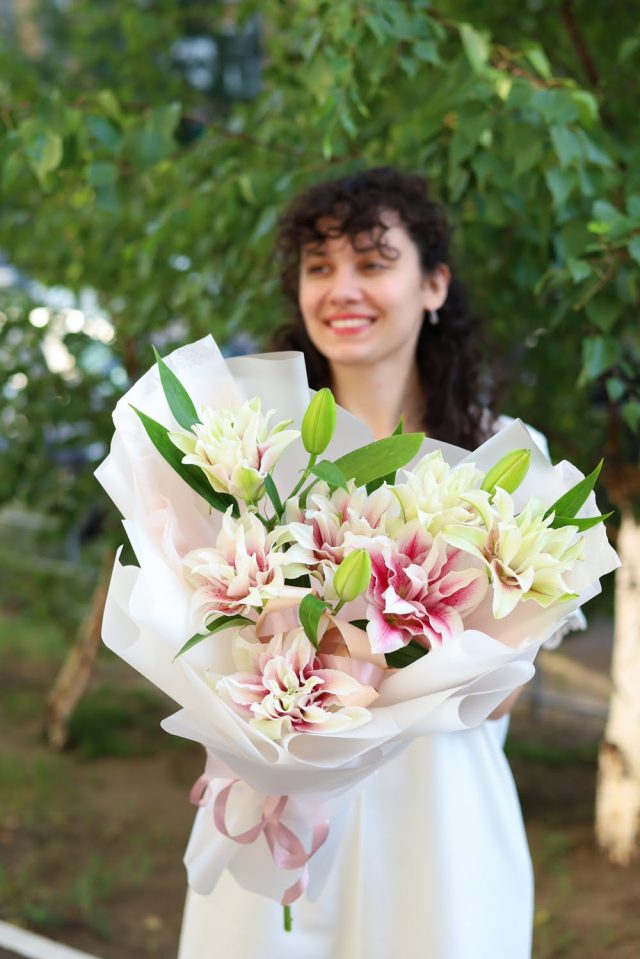 Лилии – очень стойкий цветок и при должном уходе могут радовать до 2-х недель! Высота не менее 50 см.