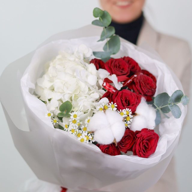 Букет с пышной гортензией, ароматной ромашкой, кустовой розой, хлопком и эвкалиптом в оформлении.