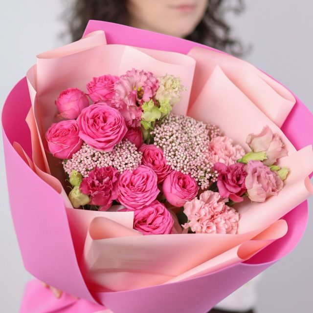 Букет с ажурной эустомой, кустовой пионовидной розой и озотамнусом в оформлении.