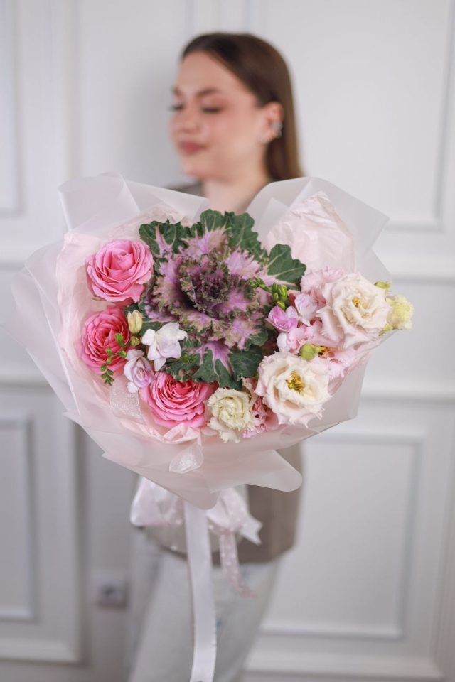 Букет с брассикой, ажурной эустомой, стойким диантусом и фрезией в оформлении.