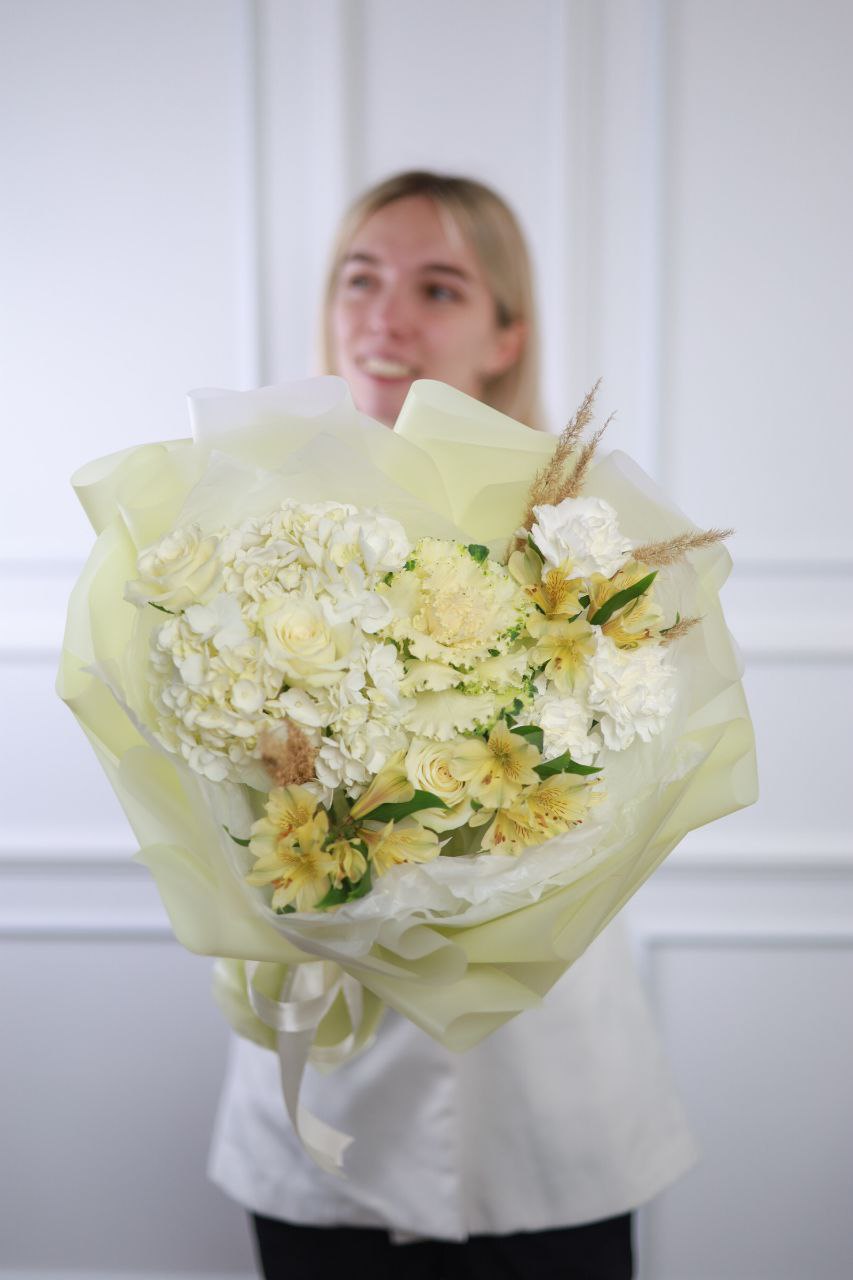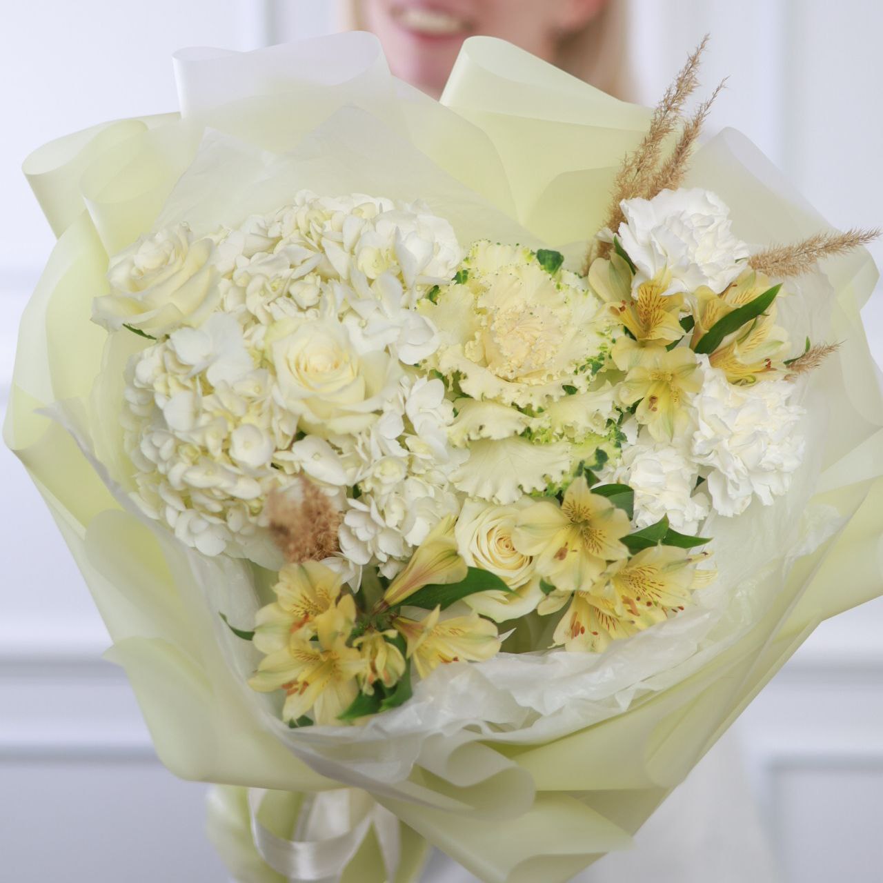 Букет с брассикой, пышной гортензией, розой, стойкой альстромерией, диантусом и сухоцветами в оформлении.