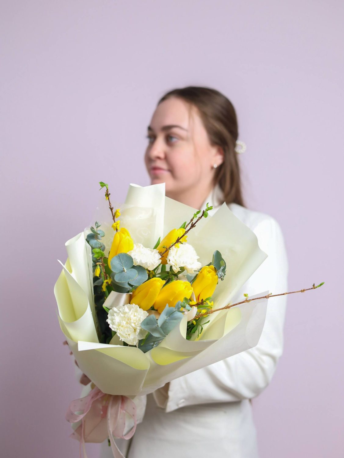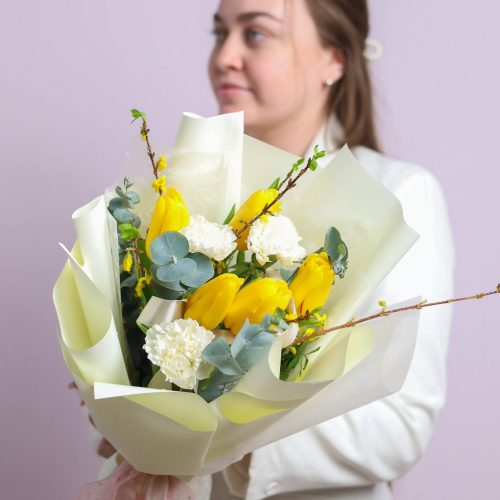 Букет тюльпанов, стойких диантусов, форзиции и душистого эвкалипта в оформлении.