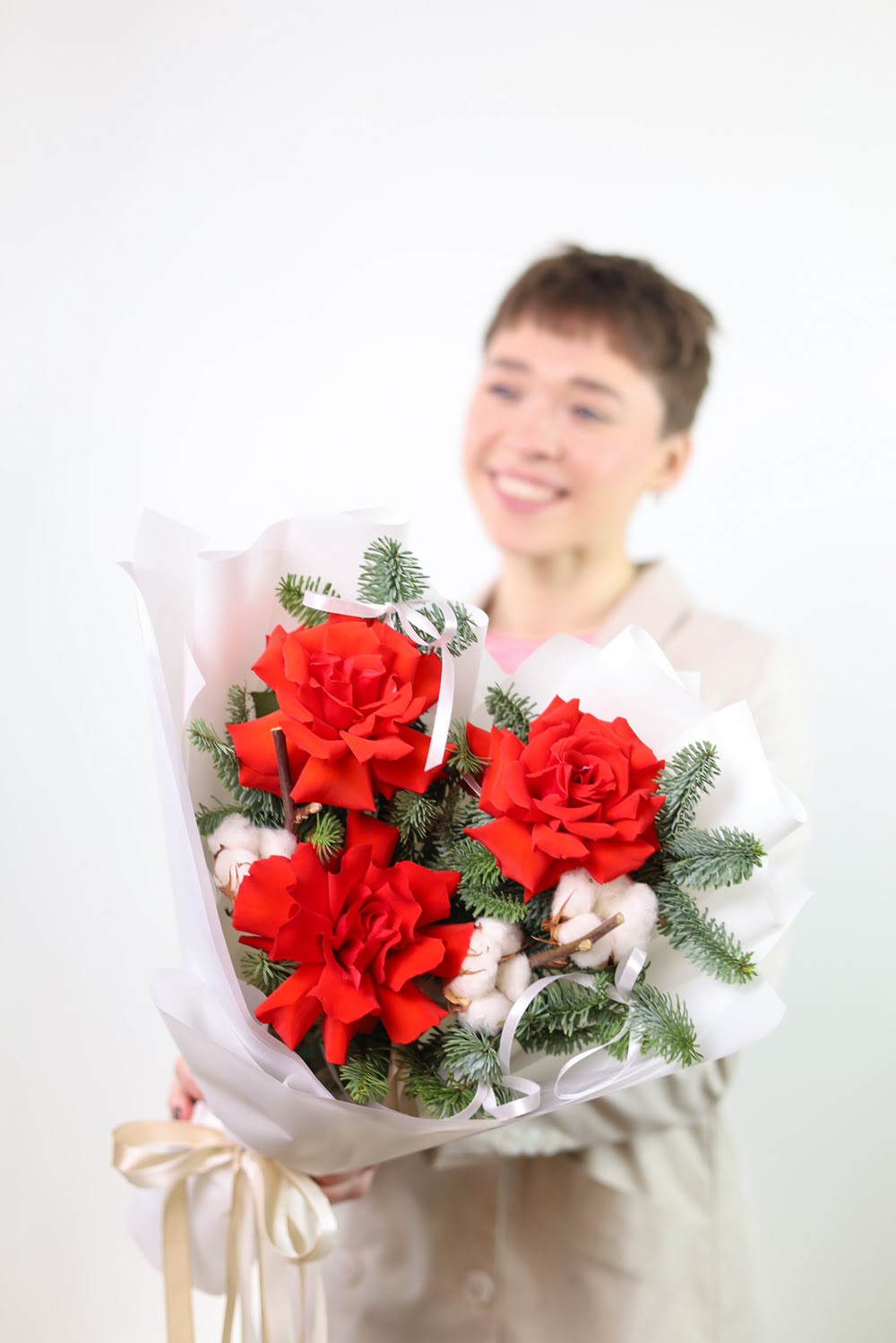 Красивый зимний букет с крупными французскими розами, натуральным хлопком и елью нобилис.