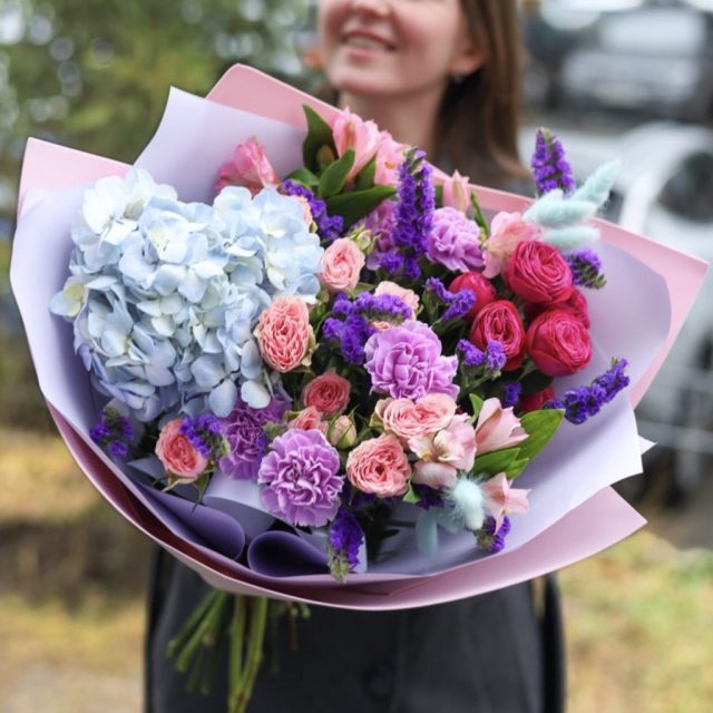 Состав: гортензия, стойкие диантусы и альстромерия, кустовые розы, статица, сухоцветы.