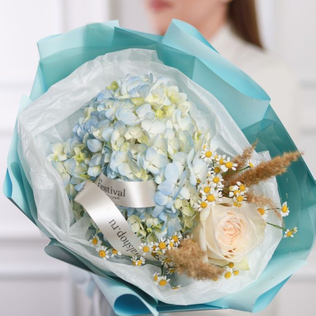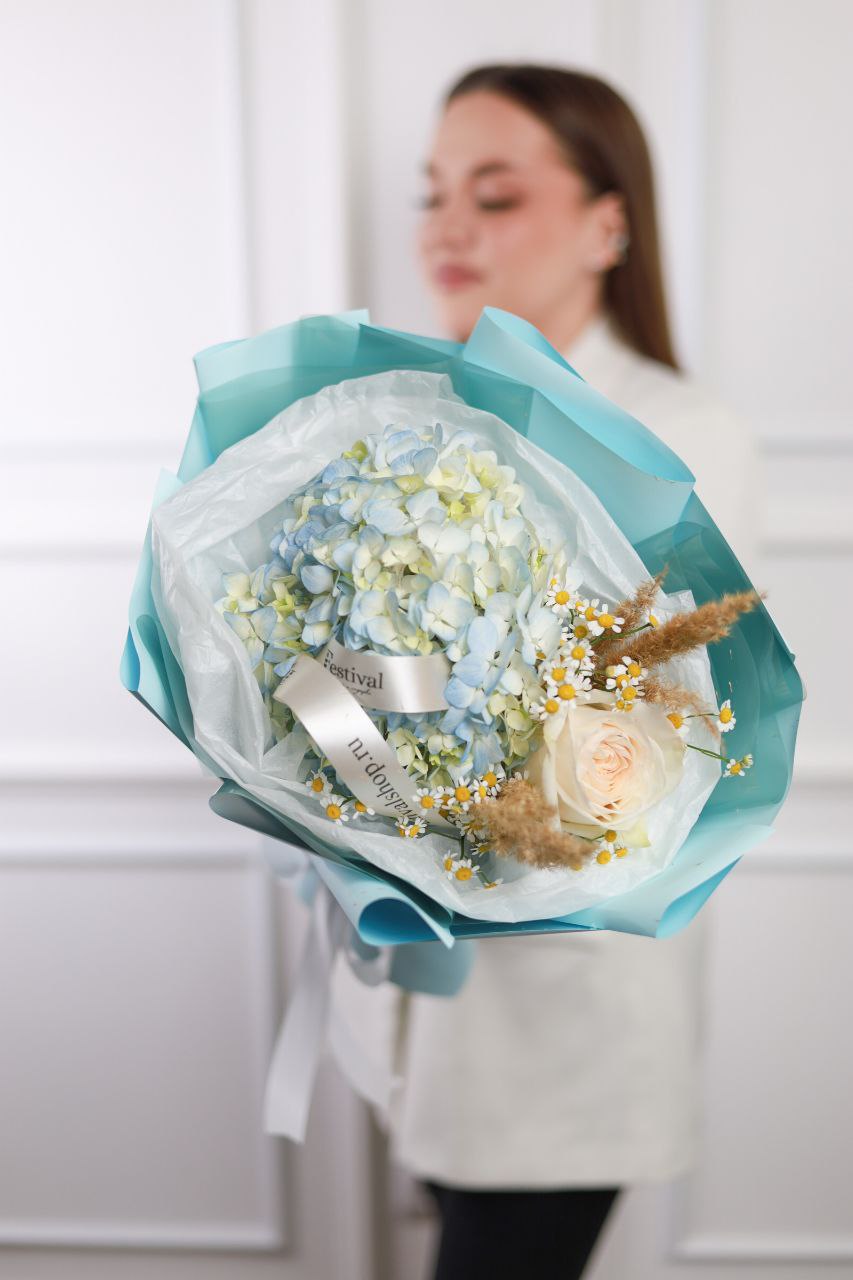 Букет с пышной гортензией, ароматной ромашкой, пионовидной розой и сухоцветом в оформлении.