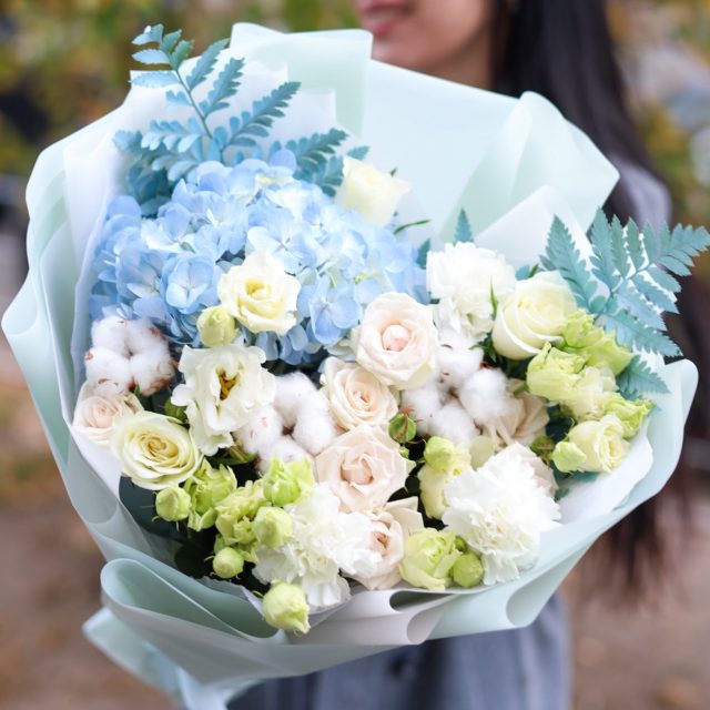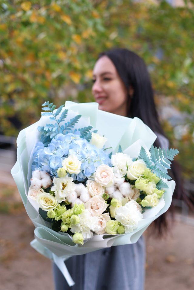 Состав: пышная гортензия, кустовые и одноголовые розы, ажурная эустома, стойкие диантусы, хлопок, крашеный папоротник.