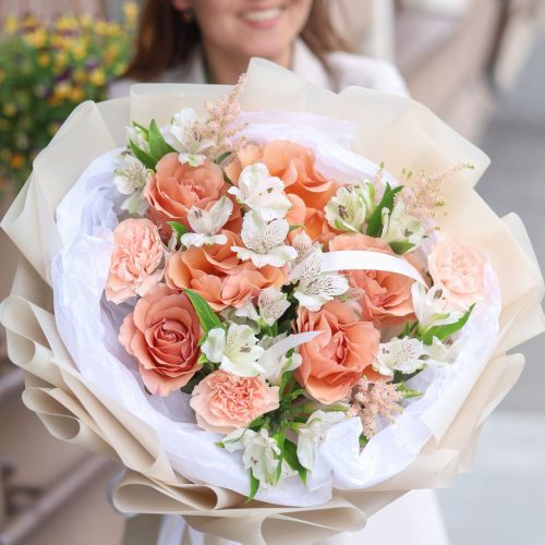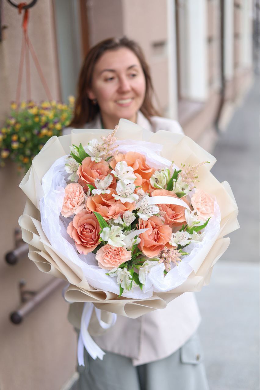 Букет с розами и стойкими диантусами и альстромерией в оформлении.