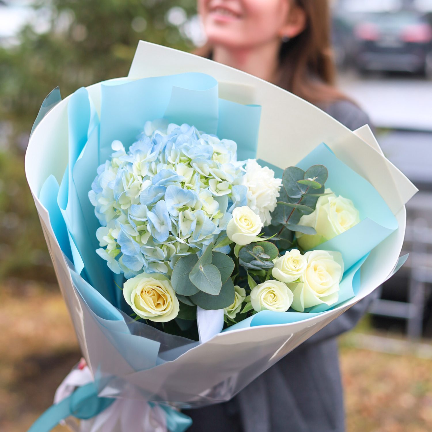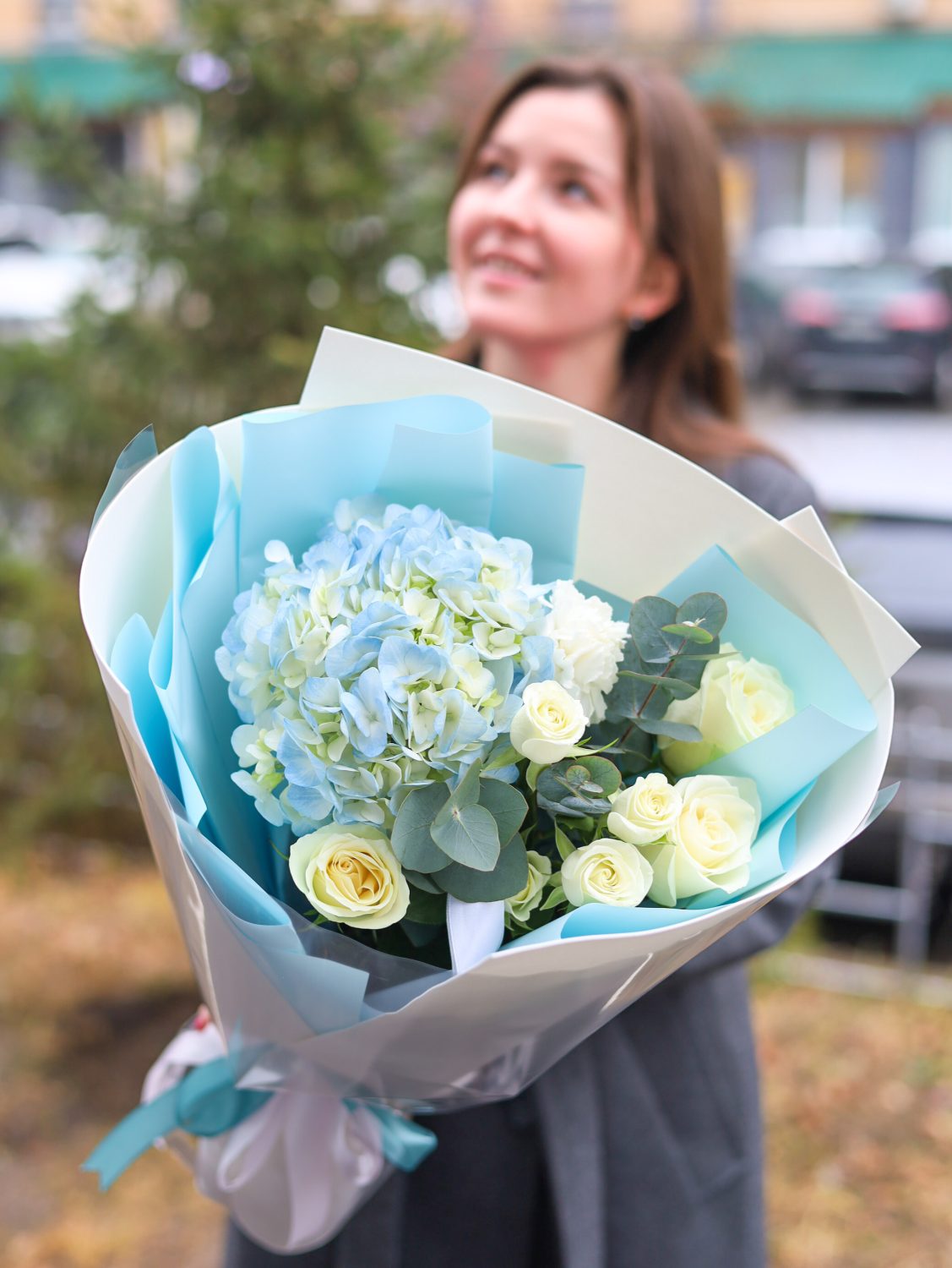 В букете: пышная гортензия, розы, стойкие диантусы, эвкалипт.