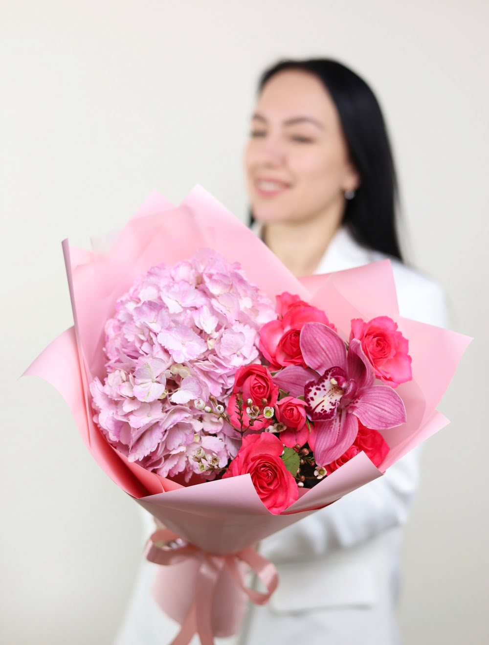 Состав: пышная гортензия, орхидея, кустовые розы, хамелациум.