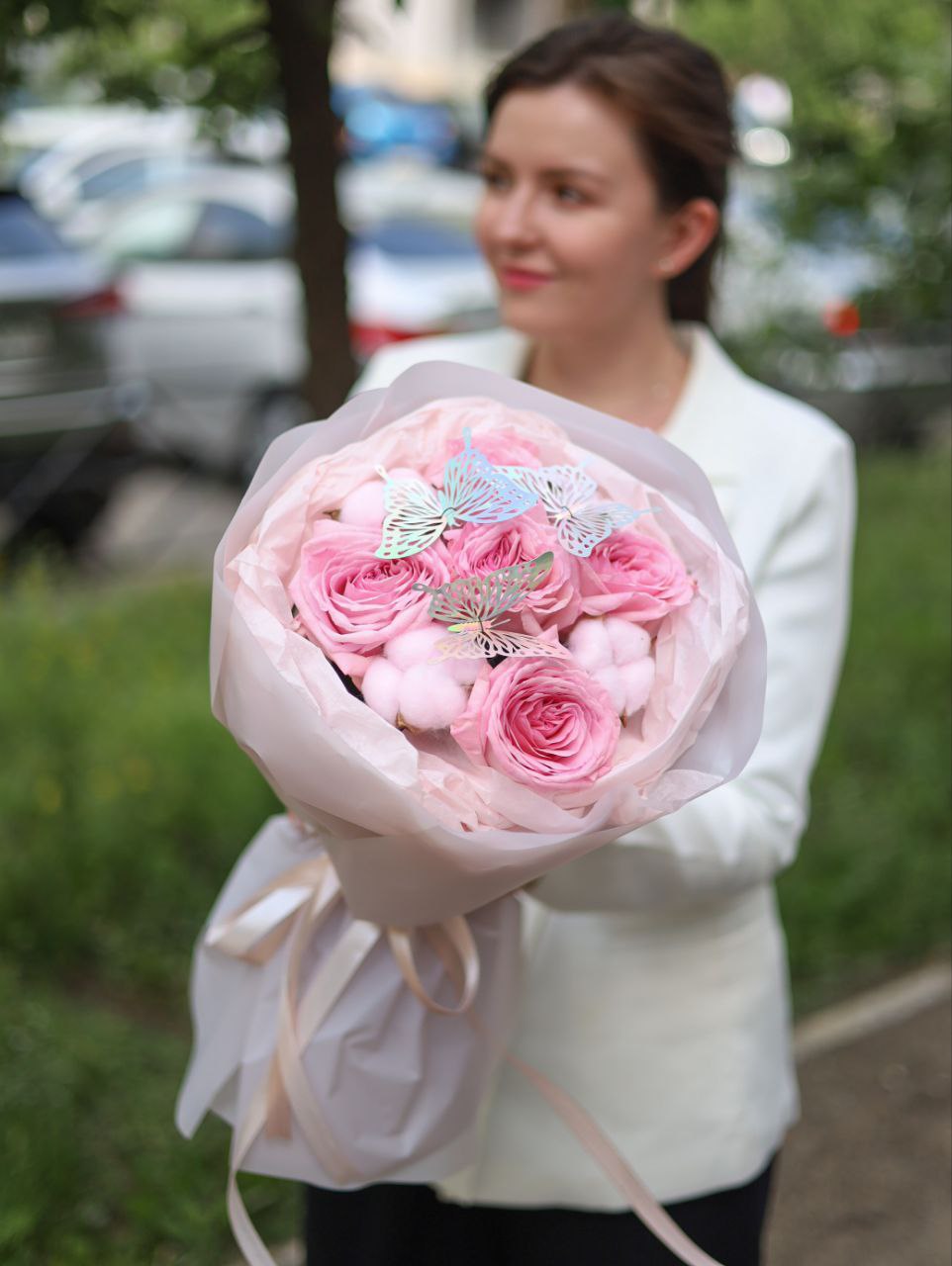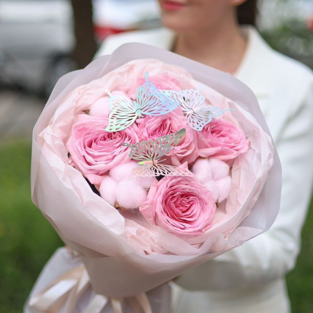 Букет с пионовиодной розой, хлопком и декоративными бабочками в оформлении.