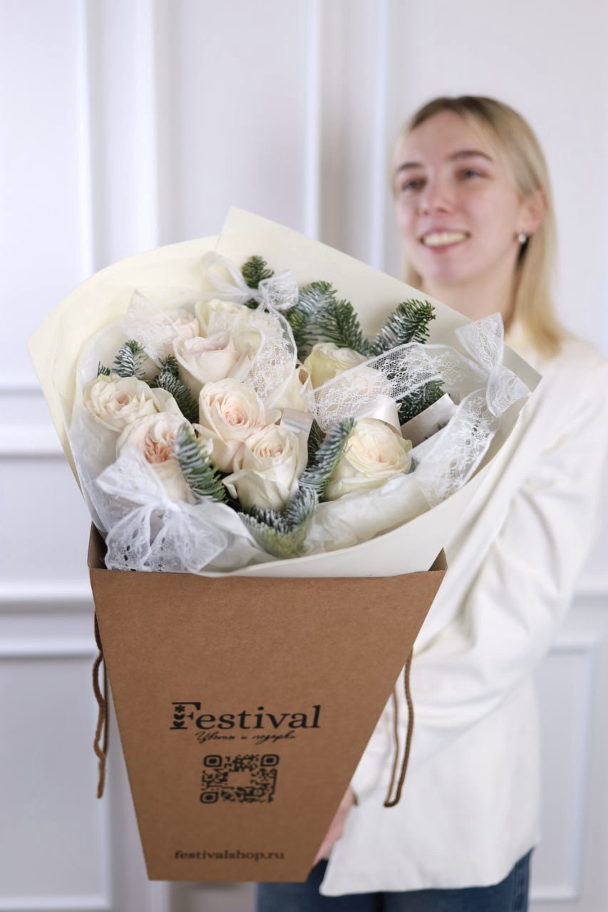 В составе букета 11 одноголовых, ароматных пионовидных роз White O’Hara с нобилисом