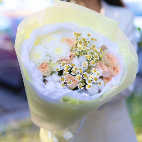 В составе букета: стойкая хризантема, ромашки, кустовая роза, душистый хлопок.