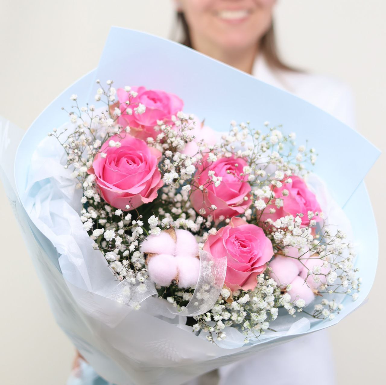 Букет роз, пышной гипсофилы и хлопка в оформлении.