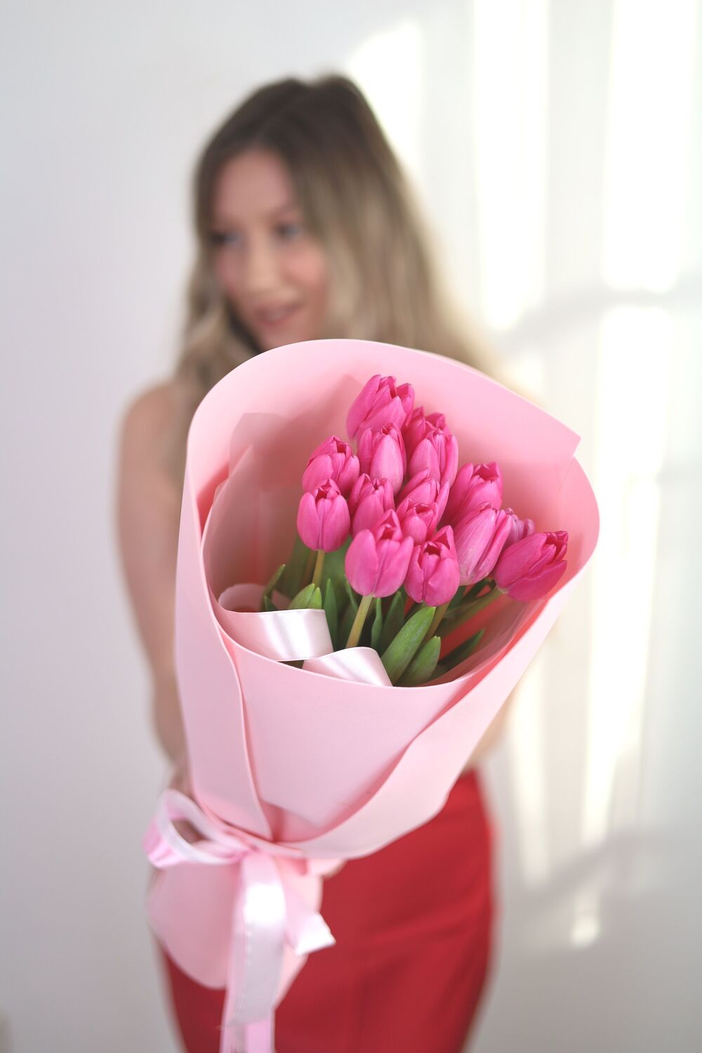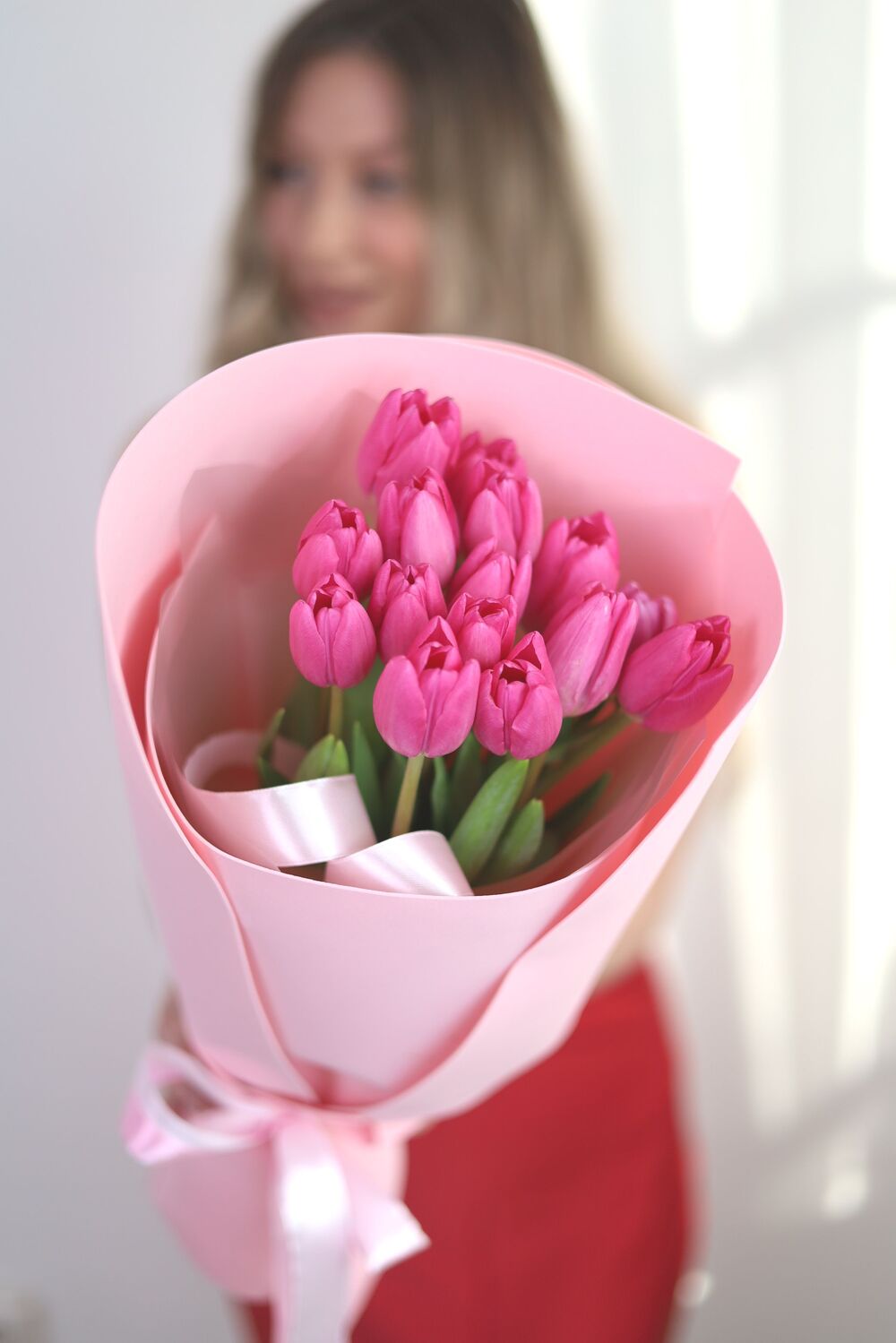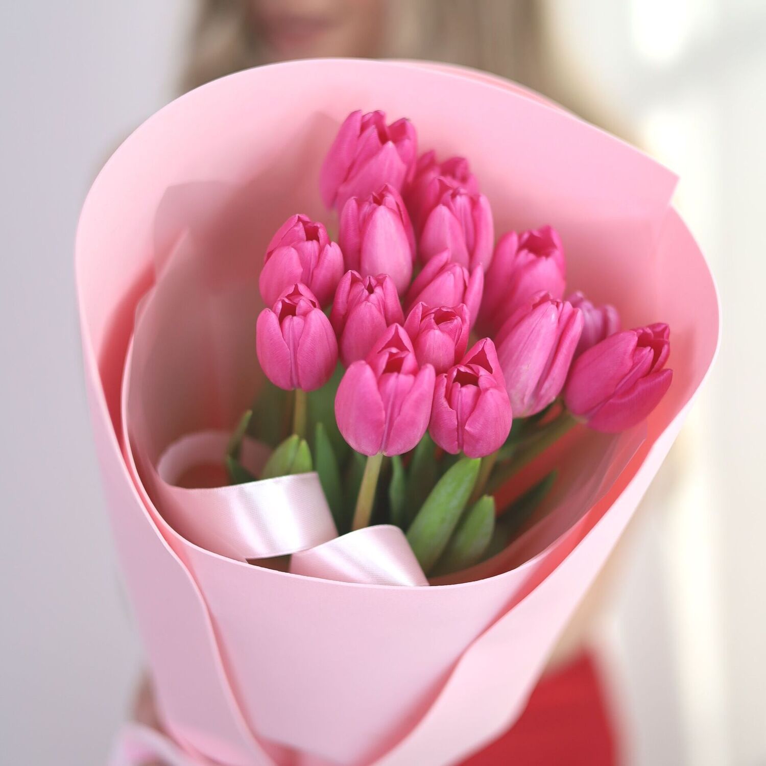 Красивый букет из 15 тюльпанов в оформлении. Оттенок тюльпанов может отличаться от светло — розового до сиреневого, малинового.