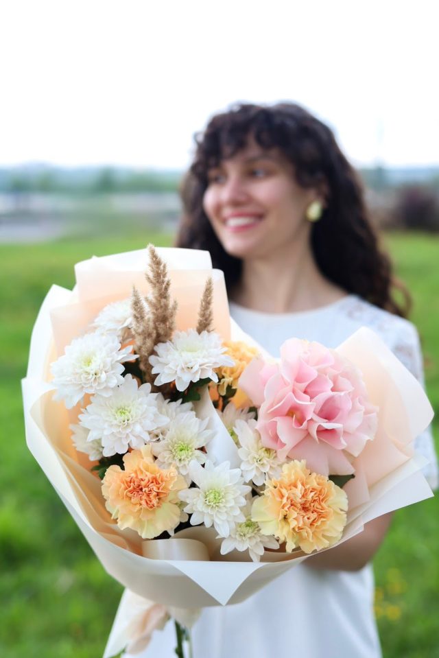 В букете: стойкие диантусы и хризантема, французская роза, сухоцветы. Высота букета около 50 см.