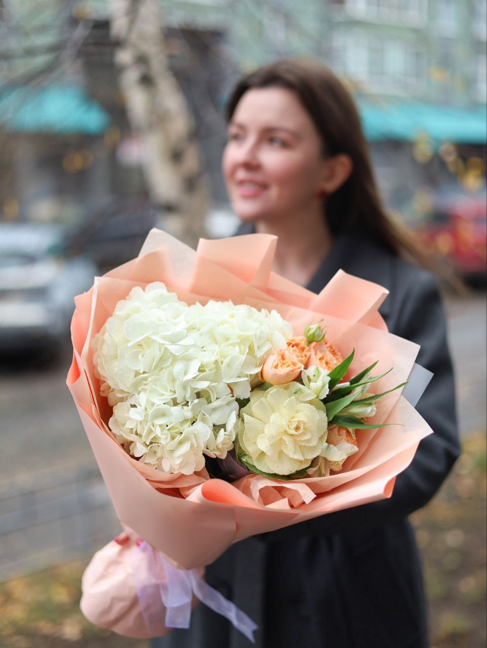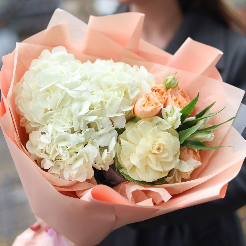 Букет с пышной гортензией, стойкой брассикой и пионовидной кустовой розой в оформлении.