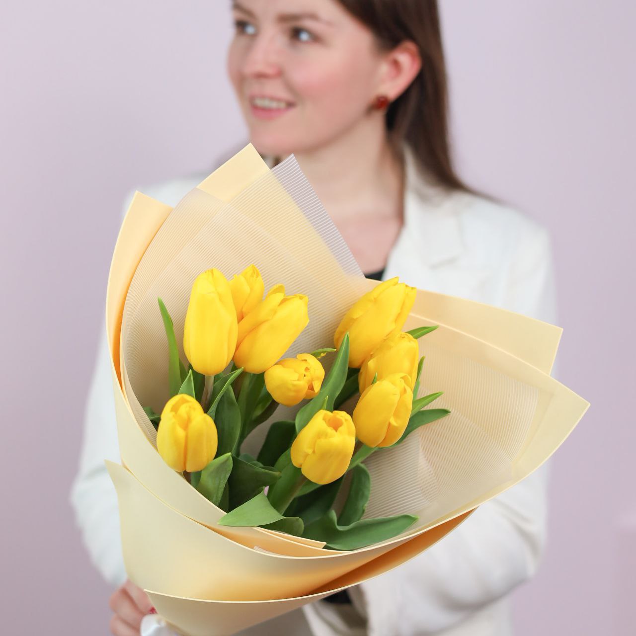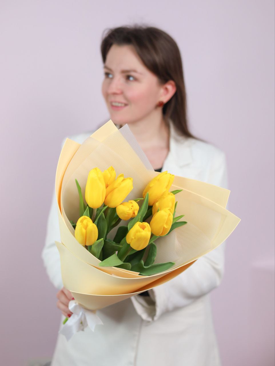 Букет солнечных тюльпанов в оформлении