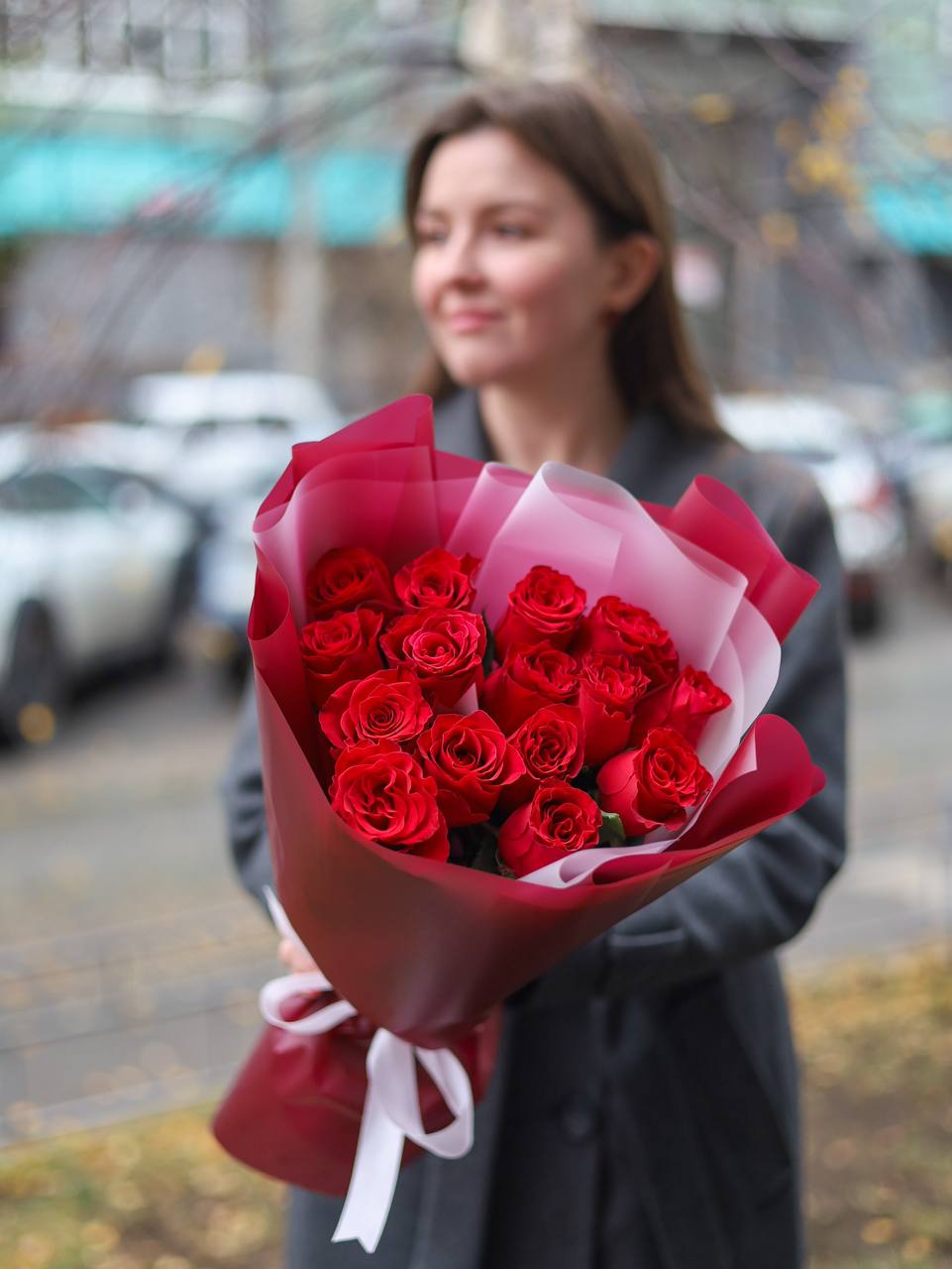 Букет из 15 роз в оформлении.