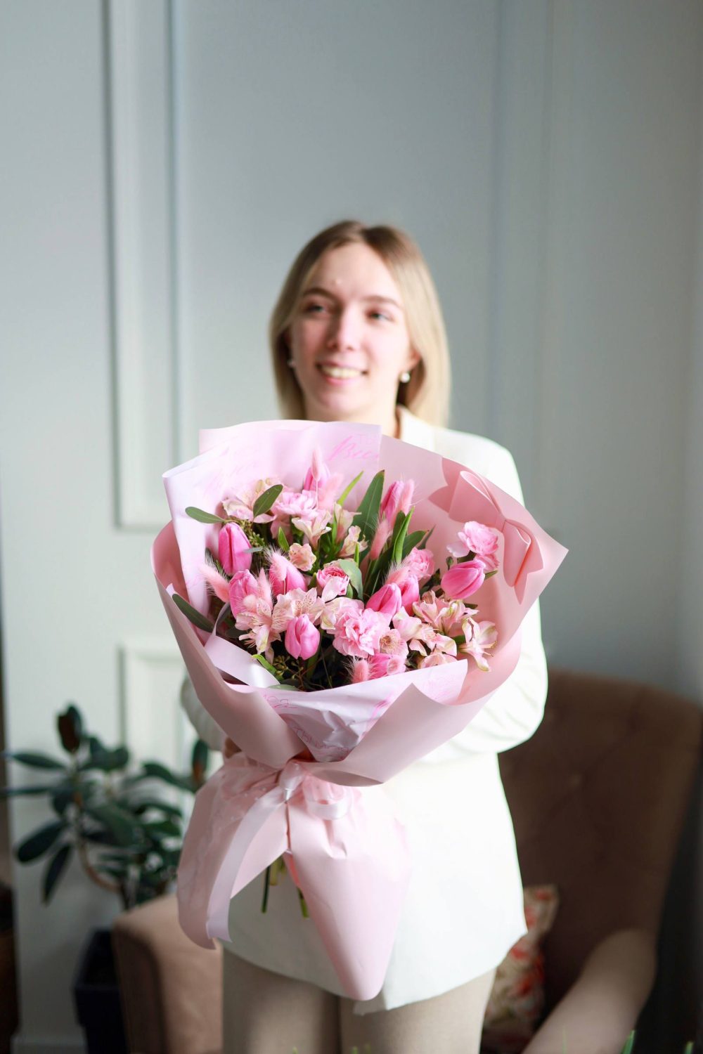 Состав: стойкие диантусы, тюльпаны, альстромерии, эвкалипт и сухоцветы