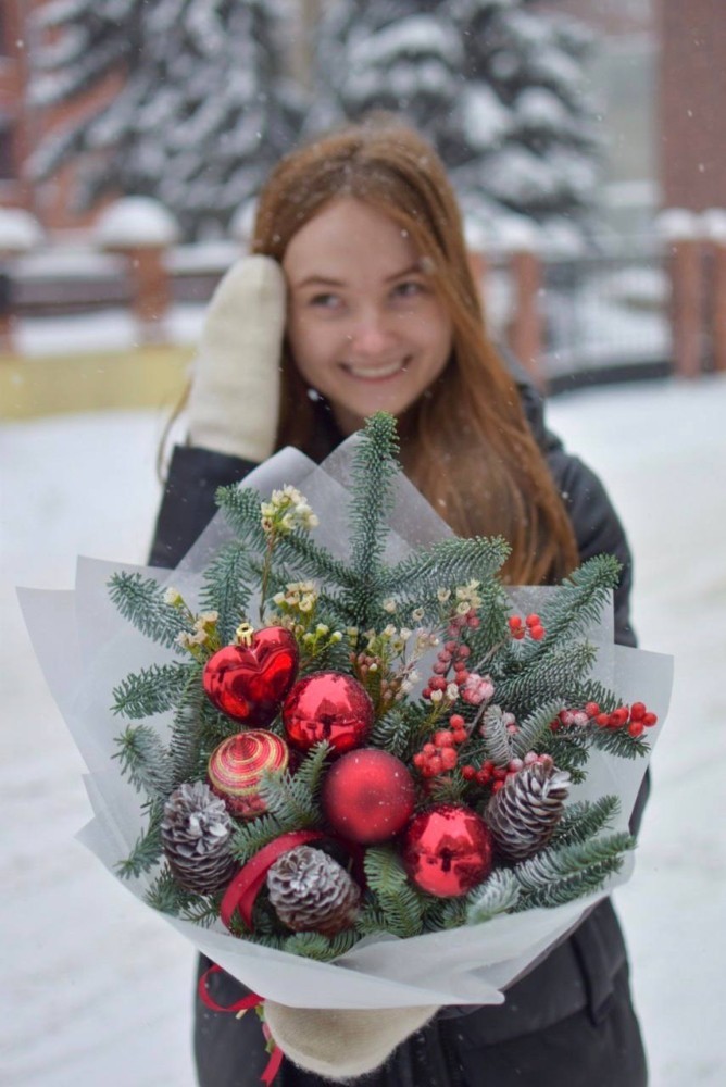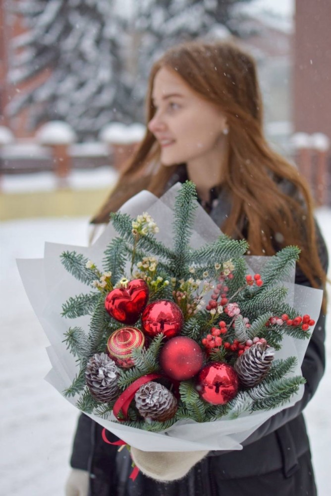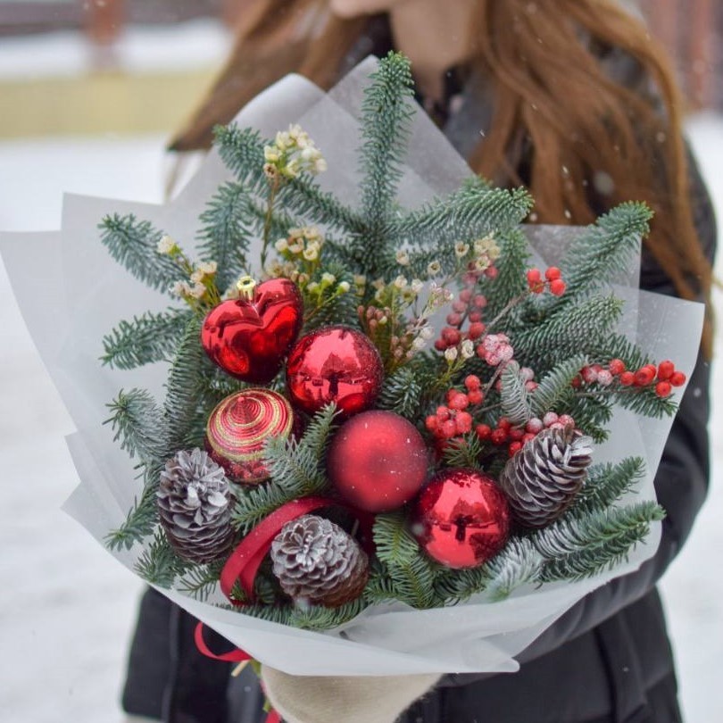 Букет с датской елью, декором, хамелациумом и илексом в оформлении.