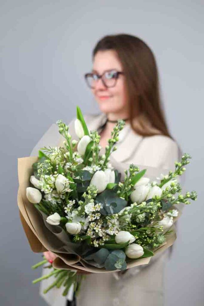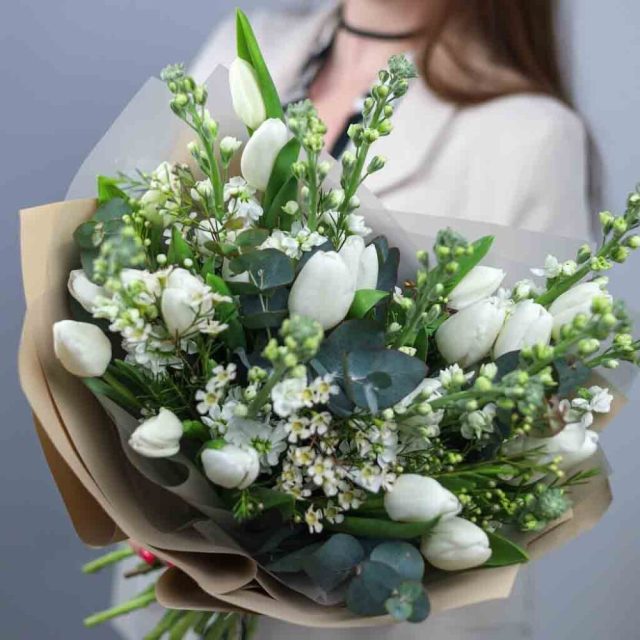 Потрясающий объёмный букет с тюльпанами (25 шт), маттиолой , хамелациумом, эвкалиптом.